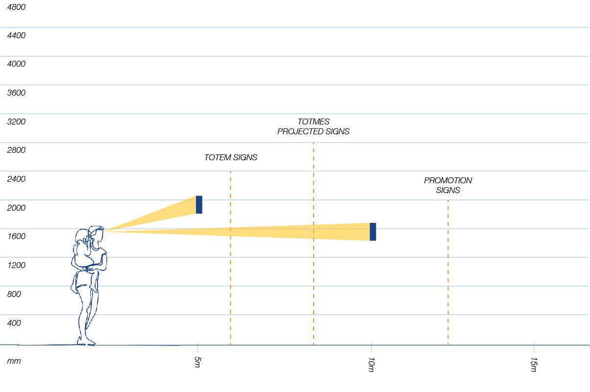 Signs should be placed perpendicular to the main flow of passenger movement to allow the passenger to find the relevant wayfinding information intuitively.