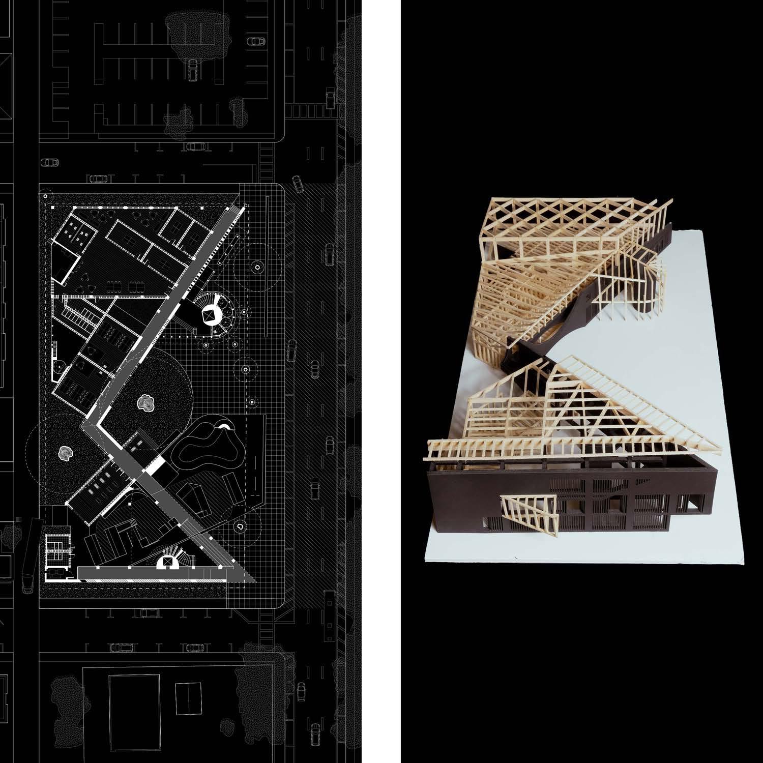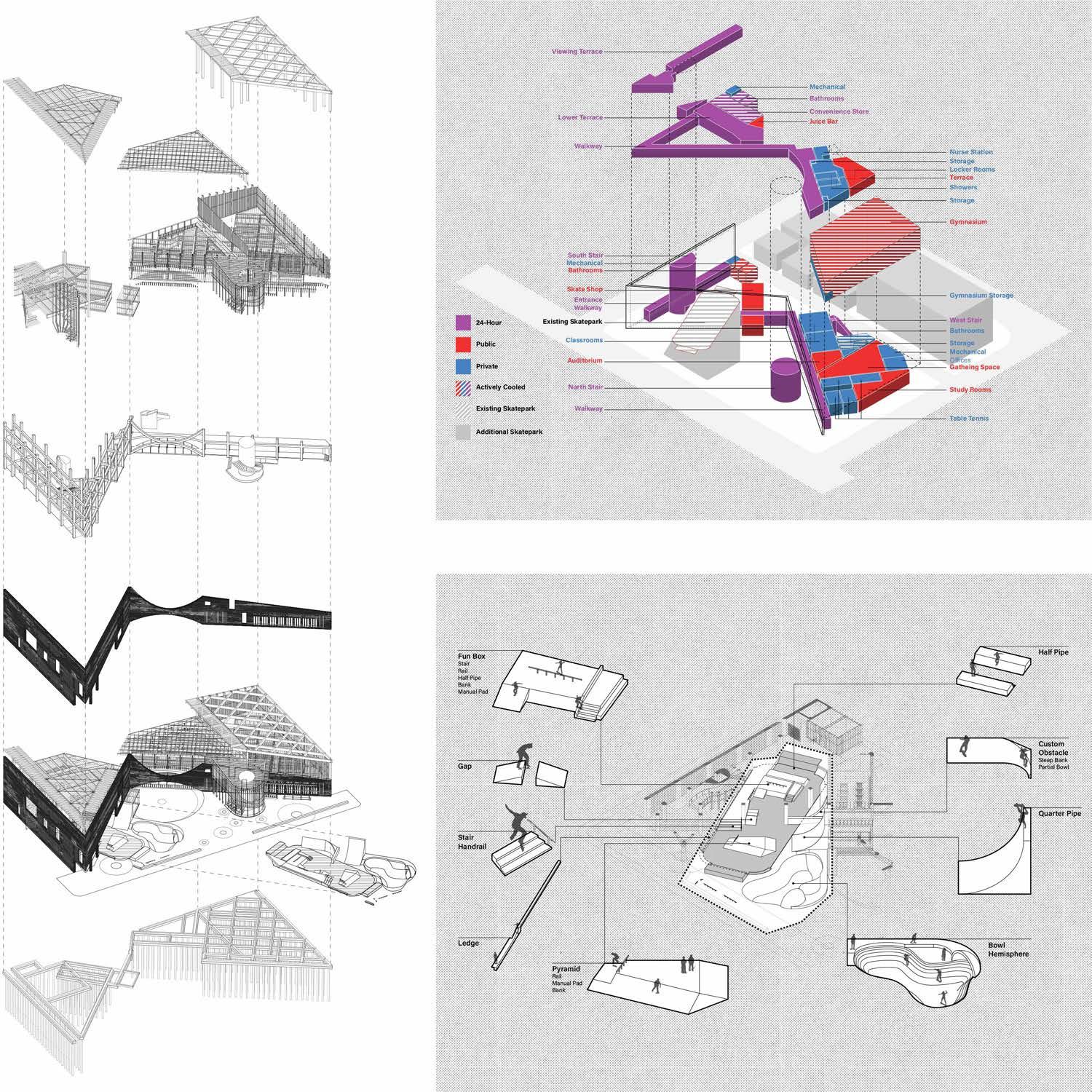 Stretches of beaches and a public park provide a perfect location for a community gathering space. This youth center is designed around an angled concrete wall creating a large plaza within as well as providing structural, programmatic, and climatic functions toward the rest of the building. The plaza provides a break in continuity along a major road; a space for all. Alongside the plaza is an extension to an existing skate park as well as new amenities like shops and a market which were much needed in the community. The center is also equipped with a gymnasium and ping-pong rooms as well as classrooms and study areas to be used by students and the large senior population.