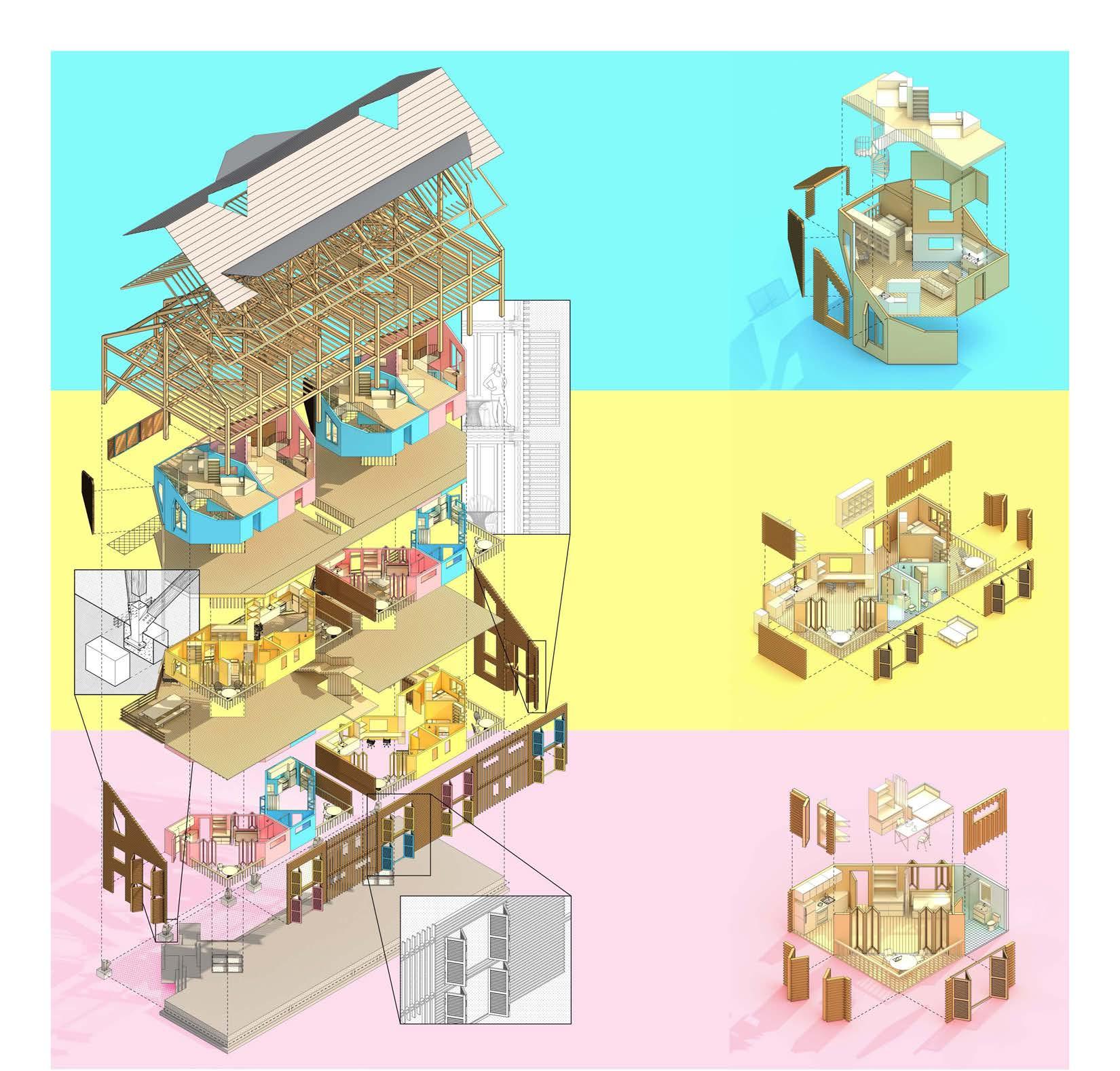 A proposal for tackling the issues of density and low-income housing within neighborhoods while increasing the quality of life. The form and program take inspiration from the vernacular houses and dense vegetation of Coconut Grove and is situated within a single lot currently zoned for a single or duplex house. Ten units of varying sizes have been implemented within a frame which utilizes the tropical environment to provide as much outdoor communal space as possible. Dense vegetation regulates sunlight and temperature of the large courtyard and outdoor dining areas that take up the entire side of the building.
