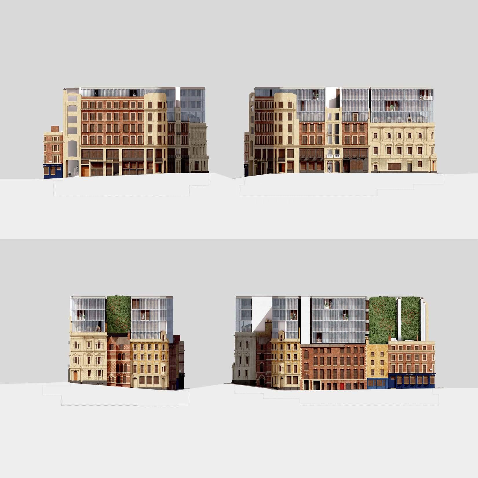 Covent Garden is a historic neighborhood which is known as the theater center of London. This project takes up an entire city block consisting of seven different buildings and converting them into much needed housing. Our proposal tries to organize the chaos. The buildings are all from different time periods with different styles and construction methods. The project revolves around a square courtyard which connects every building. This also becomes the center point for the public ground floor and is accessed by a large cut slashing the block in two creating a new public corridor.