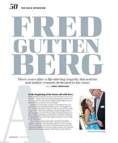 At the beginning of his Zoom call with Boca, Fred Guttenberg texted his son, Jesse, to let him know he was on an interview. “I always make sure my kids know they can reach me one way or another,”he said, and then caught himself.“Well, let my son know. It’ll take me forever to not say ‘my kids.’” Guttenberg sat at his office computer in his Parkland home, behind which hung a framed performance photo of his daughter, Jaime—in Fred’s description“a tough-as-nails 14-year-old dancer with a huge heart”—aloft and ecstatic against a black background. It’s a stirring image to remember her by, unlike the final photograph ever taken of Jaime Guttenberg, on the third floor of Marjorie Stoneman Douglas High School, with a black digital oval placed over her body by law enforcement. Jaime was the second-to-last victim—but the first identified casualty—of the school shooting that ended the lives of 17 people on Feb. 14, 2018. Since then, Fred Guttenberg has spent most of his waking hours fighting for stricter gun safety measures and criticizing politicians who accept campaign contributions from the National