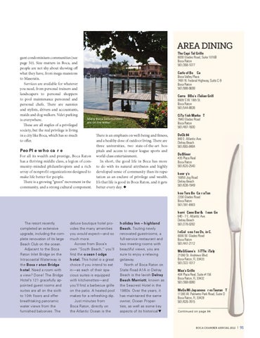 area Dining gant condominium communities (see page 50). Size matters in Boca, and people are not shy about showing off what they have, from mega mansions to Maseratis. Services are available for whatever you need, from personal trainers and landscapers to personal shoppers to pool maintenance personnel and personal chefs. There are nannies and stylists, drivers and accountants, maids and dog walkers. Valet parking is everywhere. These are all staples of a privileged society, but the real privilege is living in a city like Boca, which has so much to offer.
