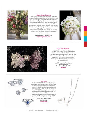 The Birks CARESSE® collection offers timeless jewelry with pavé diamonds set in 18k white gold. Diamond engagement rings, available in two sizes, from $3,650. Round brilliant-cut diamond solitaire earrings, $3,950. New to the collection, Birks CARESSE® blue sapphire and diamond engagement ring set in 18k white gold, $2,950. From the Birks collection of Freshwater cultured pearls, diamond and pearl necklace in 18k white gold, $1,595. Matching drop earrings, $1,095. Town Center at Boca Raton 561.368.6022 mayors.com