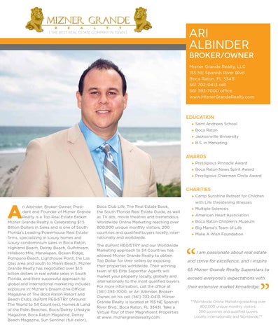 ri Albinder, Broker-Owner, President and Founder of Mizner Grande Realty is a Top Real Estate Broker. Mizner Grande Realty is Celebrating $1.5 Billion Dollars in Sales and is one of South Florida’s Leading Powerhouse Real Estate firms, specializing in luxury homes and luxury condominium sales in Boca Raton, Highland Beach, Delray Beach, Gulfstream, Hillsboro Mile, Manalapan, Ocean Ridge, Pompano Beach, Lighthouse Point, the Las Olas area and south to Miami Beach. Mizner Grande Realty has negotiated over $1.5 billion dollars in real estate sales in South Florida, and their successful approach to global and international marketing includes exposure in: Mizner’s Dream (the Official Magazine of The Boca Raton Resort and Beach Club), duPont REGISTRY (Around The World to 54 Countries), Homes & Land of the Palm Beaches, Boca/Delray Lifestyle Magazine, Boca Raton Magazine, Delray Beach Magazine, Sun Sentinel (full color),