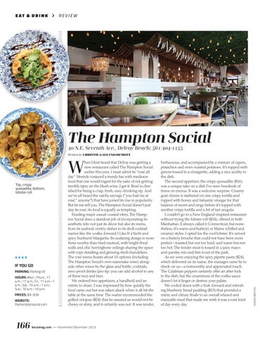 hen I first heard that Delray was getting a new restaurant called The Hampton Social earlier this year, I must admit its “rosé all day” lifestyle conjured a trendy bar with mediocre food that one would ingest for the sake of not getting terribly tipsy on the blush wine. I get it: Rosé is cherished for being a crisp, fresh, easy-drinking sip. And we’ve all heard the catchy sayings (“you had me at rosé,” anyone?) that have joined its rise in popularity. But let me tell you, The Hampton Social doesn’t just slay its rosé; its food is equally as tempting. Exuding major casual-coastal vibes, The Hampton Social does a standout job of incorporating its aesthetic into not just its décor but also its menu, from its seafood-centric dishes to its droll cocktail names like the vodka-forward I Like It a Yacht and spicy Sunburnt Margarita. Its seafaring design is more Insta-worthy than tired nautical, with bright floral walls and chic herringbone ceilings sharing the space with rope detailing and glowing shell chandeliers. The rosé menu boasts about 10 options (including The Hampton Social’s own namesake wine) alongside other wines by the glass and bottle, cocktails, zero-proof drinks (pro tip: you can add alcohol to any of these too) and beer. We ordered two appetizers, a handheld and an entrée to share. I was impressed by how quickly the food came out but was taken aback when it all hit the table at the same time. The waiter recommended the grilled octopus ($24) that he assured us would not be chewy or slimy, and it certainly was not. It was tender,