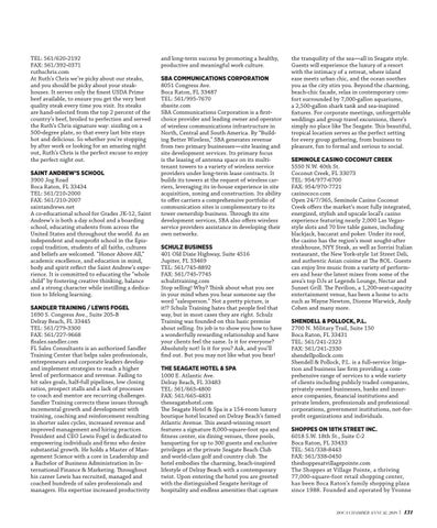 and long-term success by promoting a healthy, productive and meaningful work culture. SBA COMMUNICATIONS CORPORATION 8051 Congress Ave. Boca Raton, FL 33487 TEL: 561/995-7670 sbasite.com SBA Communications Corporation is a firstchoice provider and leading owner and operator of wireless communications infrastructure in North, Central and South America. By “Building Better Wireless,” SBA generates revenue from two primary businesses—site leasing and site development services. Its primary focus is the leasing of antenna space on its multitenant towers to a variety of wireless service providers under long-term lease contracts. It builds its towers at the request of wireless carriers, leveraging its in-house experience in site acquisition, zoning and construction. Its ability to offer carriers a comprehensive portfolio of communication sites is complementary to its tower ownership business. Through its site development services, SBA also offers wireless service providers assistance in developing their own networks. SCHULZ BUSINESS 401 Old Dixie Highway, Suite 4516 Jupiter, FL 33469 TEL: 561/745-8892 FAX: 561/745-7745 schulztraining.com Stop selling! Why? Think about what you see in your mind when you hear someone say the word “salesperson.” Not a pretty picture, is it!? Schulz Training hates that people feel that way, but in most cases they are right. Schulz Training was founded on this basic premise about selling. Its job is to show you how to have a wonderfully rewarding relationship and have your clients feel the same. Is it for everyone? Absolutely not! Is it for you? Ask, and you’ll find out. But you may not like what you hear! THE SEAGATE HOTEL & SPA 1000 E. Atlantic Ave. Delray Beach, FL 33483 TEL: 561/665-4800 FAX: 561/665-4831 theseagatehotel.com The Seagate Hotel & Spa is a 154-room luxury boutique hotel located on Delray Beach’s famed Atlantic Avenue. This award-winning resort features a signature 8,000-square-foot spa and fitness center, six dining venues, three pools, banqueting for up to 300 guests and exclusive privileges at the private Seagate Beach Club and world-class golf and country club. The hotel embodies the charming, beach-inspired lifestyle of Delray Beach with a contemporary twist. Upon entering the hotel you are greeted with the distinguished Seagate heritage of hospitality and endless amenities that capture