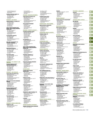 HOST.NET 3500 NW Boca Raton Blvd., Suite 901 Boca Raton, FL 33431 TEL: 561/869‑6100 FAX: 561/869‑3321 lenny@host.net host.net Lenny Chesal INTERVAL OWNERSHIP LA BOCA CASA BY THE OCEAN RESORT 365 N Ocean Blvd. Boca Raton, FL 33432 TEL: 561/392‑0885 FAX: 561/367‑8127 bocacasa@aol.com Aldo Cepero INVESTIGATIVE SERVICES FROST SECURITY GROUP LLC 7777 Glades Road, Suite 100 Boca Raton, FL 33434‑1000 TEL: 561/245‑4716 FAX: 561/226‑2565 tfrost@frost‑security‑group.org frost‑security‑group.org Tim Frost INVESTMENT BELL ROCK CAPITAL, LLC 980 N. Federal Highway, Suite 110 Boca Raton, FL 33432 TEL: 561/289‑5308 Jackie@BellrockCapital.com bellrockcapital.com Jacqueline Reeves COMERICA BANK 1675 N. Military Trail, Suites 100 and 600 Boca Raton, FL 33486 TEL: 561/961‑6600 FAX: 561/961‑6620 avmastrofrancesco@comerica.com comerica.com Angela Mastrofrancesco DYLANJOVINE.COM 740 Periwinkle St. Boca Raton, FL 33486 TEL: 917/270‑9234 dylanjovine@gmail.com DylanJovine.com Dylan Jovine FMSBONDS, INC. 4775 Technology Way Boca Raton, FL 33431 TEL: 561/893‑6188 FAX: 561/241‑4784 pperlman@fmsbonds.com fmsbonds.com Philip Perlman WEINSTEIN WEALTH MANAGEMENT 11906 Preservation Lane Boca Raton, FL 33498 TEL: 732/407‑8063 FAX: 609/228‑5528 BWeinstein@SterneAgee.com weinsteinwealth.com Bruce Weinstein INVESTMENT ‑ ADVISORY SERVICE ABR INVESTMENT STRATEGY LLC 6501 Congress Ave., Suite 100 Boca Raton, FL 33487 TEL: 561/948‑2300 brad@abr‑is.com abrinvestmentstrategy.com Brad Gastwirth BELL ROCK CAPITAL, LLC 980 N. Federal Highway, Suite 110 Boca Raton, FL 33432 TEL: 561/289‑5308 Jackie@BellrockCapital.com BellRockCapital.com Jacqueline Reeves GITTERMAN & ASSOCIATES WEALTH MANAGEMENT LLC / E‑SQUARED FINANCIAL SERVICES 7763 Glades Road Boca Raton, FL 33434 TEL: 561/477‑5340 FAX: 888/476‑1314 dkatz@gawmllc.com gawmllc.com / esquaredfinancial.com David Katz HERITAGE INVESTMENT GROUP 2480 NE 23rd St. Pompano Beach, FL 33062 TEL: 954/785‑5400 FAX: 954/733‑0966 sbliss@heritageinvestment.com heritageinvestment.com Stacy L. Bliss INDIAN RIVER FINANCIAL GROUP 7805 NW Beacon Square Blvd., Suite 102 Boca Raton, FL 33487 TEL: 561/362‑0331 FAX: 561/362‑4003 paul@paulmilleradvisor.com paulmilleradvisor.com Paul Miller