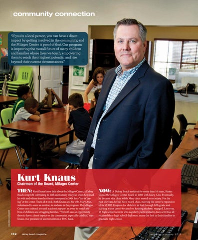 Kurt Knaus knew little about the Milagro Center, a Delray Beach nonprofit celebrating its 20th anniversary this year, when he joined his wife and others from her former company in 2004 for a “day of caring” at the center. That’s all it took. Both Knaus and his wife, Mary Ann, volunteered to serve as mentors to students in the program. The Milagro Center uses cultural arts and academic support as a way to enrich the lives of children and struggling families. “We both saw an opportunity there to have a direct impact on the community, especially children,” says Knaus, vice president of asset resolution at PNC Bank.