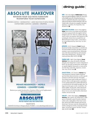 table 26°—1700 S. Dixie Highway. Contemporary American. Take a quarter-cup of Palm Beach, a tablespoon of Nantucket, a pinch of modern American cookery and a couple gallons of the owners’ savoir faire, and you have Eddie Schmidt’s and Ozzie Medeiros’s spot. The menu roams the culinary globe for modest contemporary tweaks on classically oriented dishes. Try the fried calamari “Pad Thai.” • Dinner daily. 561/855-2660. $$$ march/april 2015