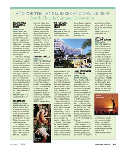 AND FOR THE LANDLUBBERS AND DAYTRIPPERS: South Florida Summer Diversions Loxahatchee evergLades tours Where: Parkland What’s the aLLure: An airboat ride is the easiest way to get into the heart of Florida’s wilderness, the Everglades, pegged as one of the seven natural wonders of North America. It may not be as peaceful as a canoe or a kayak, but it’s the noisy, fun and fast alternative, an adventurous way to explore this eccentric and fragile ecosystem. The Everglades of the Loxahatchee Preserve is more than a remnant swamp just past our western suburbs; it is the northernmost tip of the largest subtropical wilderness in the United States. It is, as Marjorie Stoneman Douglas said, a true “river of grass”—for which airboats are made. The airboat skims over marshland, startling slithery alligators, slicing through floating islands, flushing flocks of ibis and herons and roseate spoonbills out of the sawgrass. This is about as real a Florida experience as one can get. contact: 800/683-5873, evergladesairboattours.com