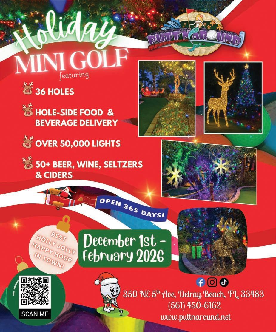 S The lighting of Delray Beach’s 100-foot Christmas Tree will kick off the holiday season on Dec. 2. From 6 to 9 p.m., Downtown Delray will transform into a magical yuletide village, complete with ice skating, mini golf, a gingerbread house and pictures with Santa, who will light the tree himself at 7 p.m. There will also be a host of activities on Atlantic Avenue, including carolers and a silent disco. downtowndelraybeach.com/holidays