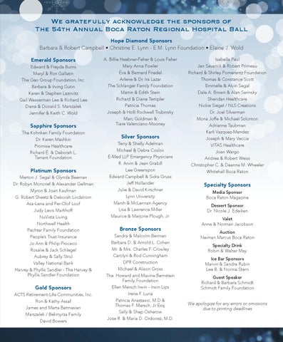 We gratefully acknowledge the sponsors of The 54th Annual Boca Raton Regional Hospital Ball Hope Diamond Sponsors Barbara & Robert Campbell • Christine E. Lynn - E.M. Lynn Foundation • Elaine J. Wold Emerald Sponsors