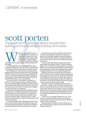 hat does a homebuilder do when a housing bubble bursts and home values plummet? Riding out the crisis, changing businesses, going into debt or bankruptcy, or early retirement would be four possibilities. Drinking oneself into oblivion, while tempting, would be the least advisable option. Scott Porten, the Delray Beach homebuilder behind Porten Companies, found the best way of all to turn the real estate lemon into lemonade: He became a professional community volunteer. The Washington, D.C. native and Emory University business graduate moved to Delray to develop homes in 1985. He quickly established a lucrative niche brand, focusing on multifamily residences in a predominantly single-family market. He developed enduring luxury condos and townhouses like City Walk, the Estuary and Harbour House. Then came the bubble. “It became clear that we were headed for something,” says Porten, 50. “The last acquisition I did was in 2006, and then in ’08, I basically sold my largest land holdings. I needed something to keep me busy. Quite frankly, this town had done a lot for me. I have my home here, and I made a lot of money here; I thought it was time to give back to the community.” In the wake of the housing bubble, Porten shifted his career to community service. In 2008, he joined the board of directors for Old School Square, then the Site Plan Review and Appearance board. In 2010, he became the Delray Beach Chamber of Commerce’s Governmental Affairs committee chairman, a role for which he recently won Director of the Year at the Chamber’s 22nd annual Luminary Gala. “Scott has brought the Greater Delray Beach Chamber of Commerce a clear focus for the future,” says Kimberly Camejo, chairman of the board for the Chamber. “His business knowledge has assisted in the growth of the Governmental Affairs committee.” 34