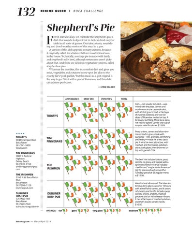 or St. Patrick’s Day, we celebrate the shepherd’s pie, a dish that sounds foolproof but in fact can land on your table in all sorts of guises. Our idea: a tasty, nourishing and drool-worthy version of this meal in a pan. A version of this dish appears in many cultures, because it originally called for whatever leftover roasted meat was in the house. Technically, a cottage pie is made with lamb, and shepherd’s with beef, although restaurants aren’t picky about that. And there are delicious vegetarian versions, called shepherdess pies. Whatever the moniker, this is a comfort dish and gives you meat, vegetables and potatoes in one spot. It’s akin to the county fair’s“pork parfait,”but this meal-in-a-pot original is the way to go. Pair it with a pint of Guinness, and this dish can achieve perfection. —LYNN KALBER