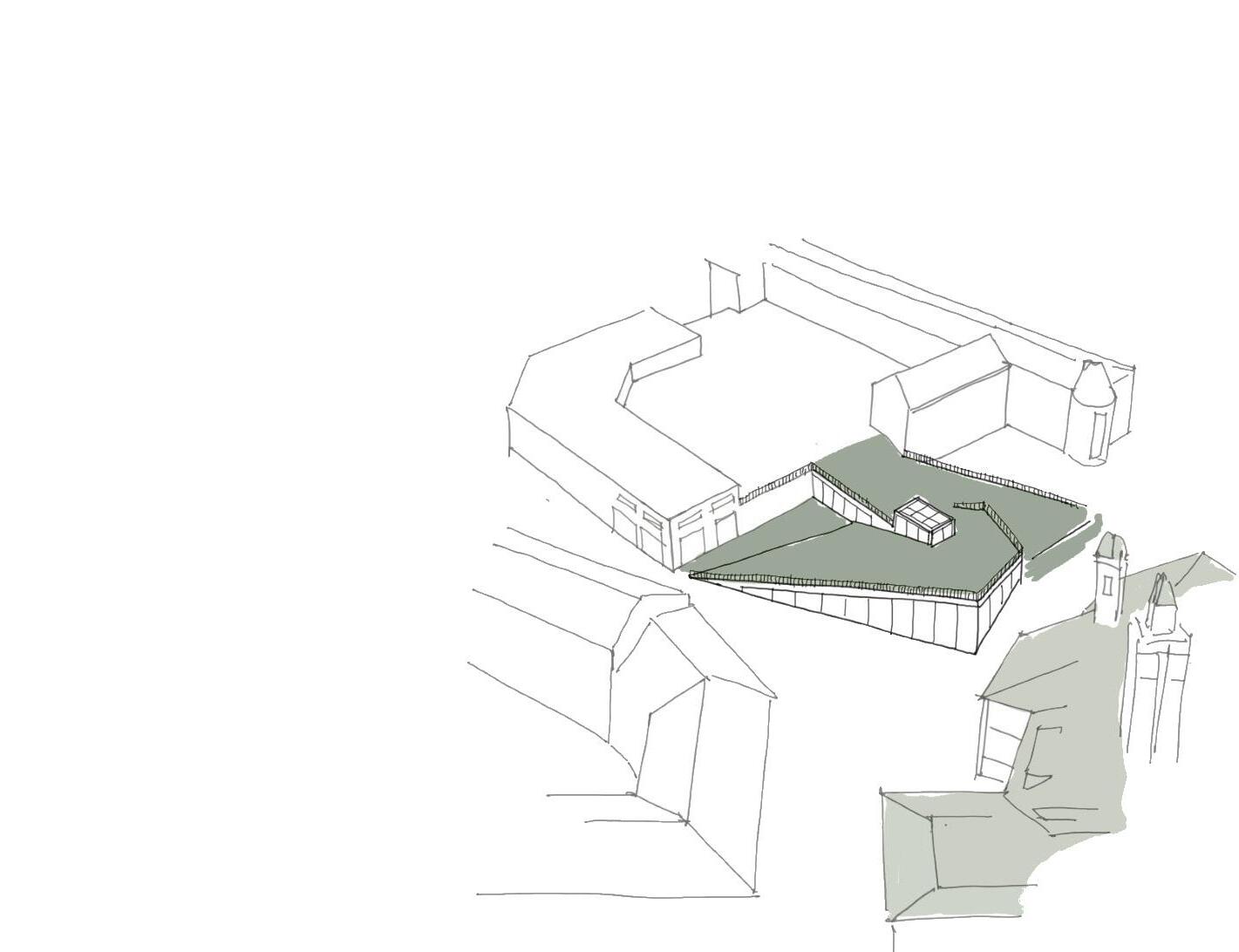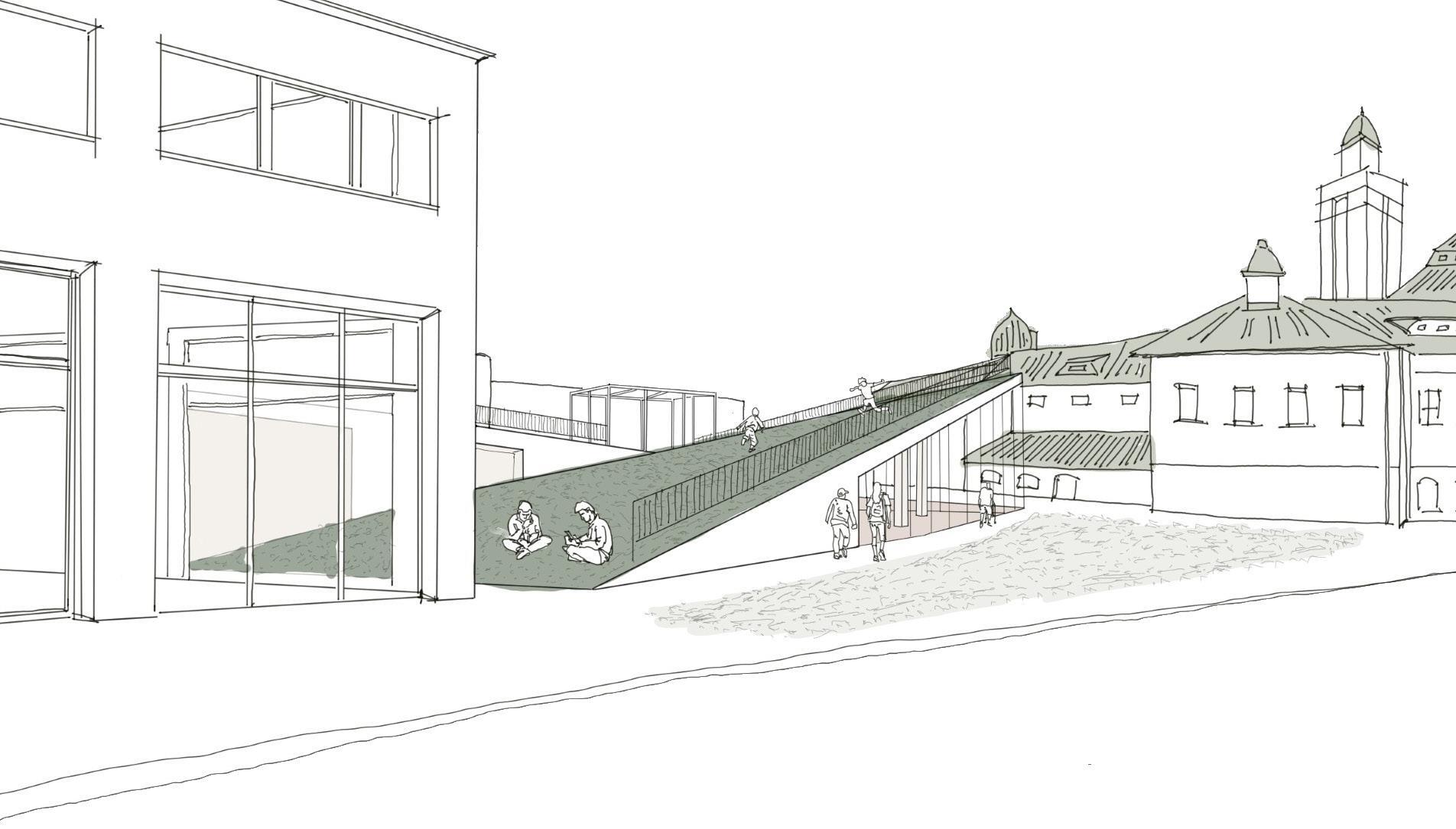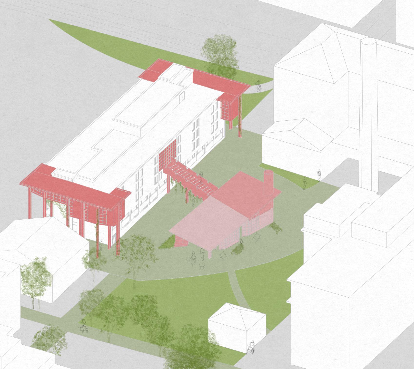Rakennusperinnön hoidon kurssilla suunnittelimme täydennysrakennuksen Tampereen Juhannuskylään puretun paloaseman paikalle. Tavoitteena oli luoda kokonaisuus, joka sulautuu ympäristöönsä mutta näyttäytyy paikoin vahvasti. Moneen suuntaan avautuva viherkatto muodostaa kaikille avoimen pihan, joka jatkaa viereisen päiväkodin leikkialuetta ja kutsuu eri-ikäisiä yhteiseen oleskeluun. Katon alle sijoittuva ikäihmisten kohtaamispaikka tarjoaa tiloja yhdessäoloon esimerkiksi puutarhassa sekä harrastuksiin, kuten yhteiseen ruoanlaittoon. Kulmakahvila tuo alueen käyttäjät yhteen katon alle ja osaksi elävää kaupunkitilaa.