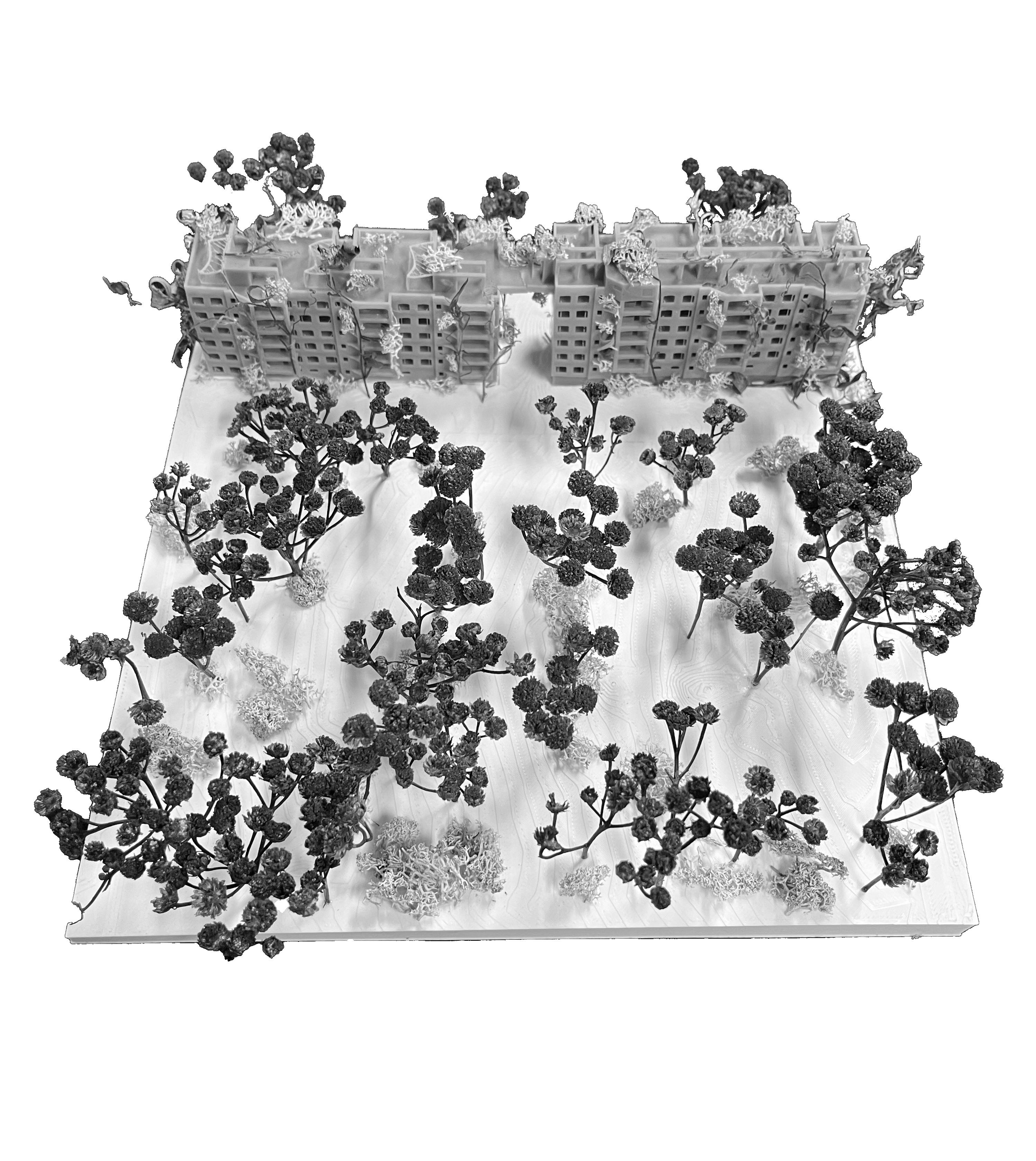 Rakennussuunnittelu V -kurssilla keskityimme hoivan integroimiseen arkkitehtuuriin Tampereen Pohjois-Hervannan alueella. Ryhmämme suunnitteli konseptin, jossa suuri parkkialue ja sen ympäristö vehreytetään vaiheittain: pysäköintialueet pienenevät, asfaltti korvataan kasvillisuudella, ja katoille muodostetaan yhteisötiloja, kuten kasvihuoneita, verstaita ja saunoja. Parvekkeet laajennetaan pihoiksi hirsirakentein, ja lisääntyvä vihreys parantaa asukkaiden elinoloja sekä tukee paikallista ekosysteemiä. Konsepti painottaa yhteisöllisyyttä, omavaraisuutta sekä ihmisen ja luonnon välistä vuorovaikutusta.