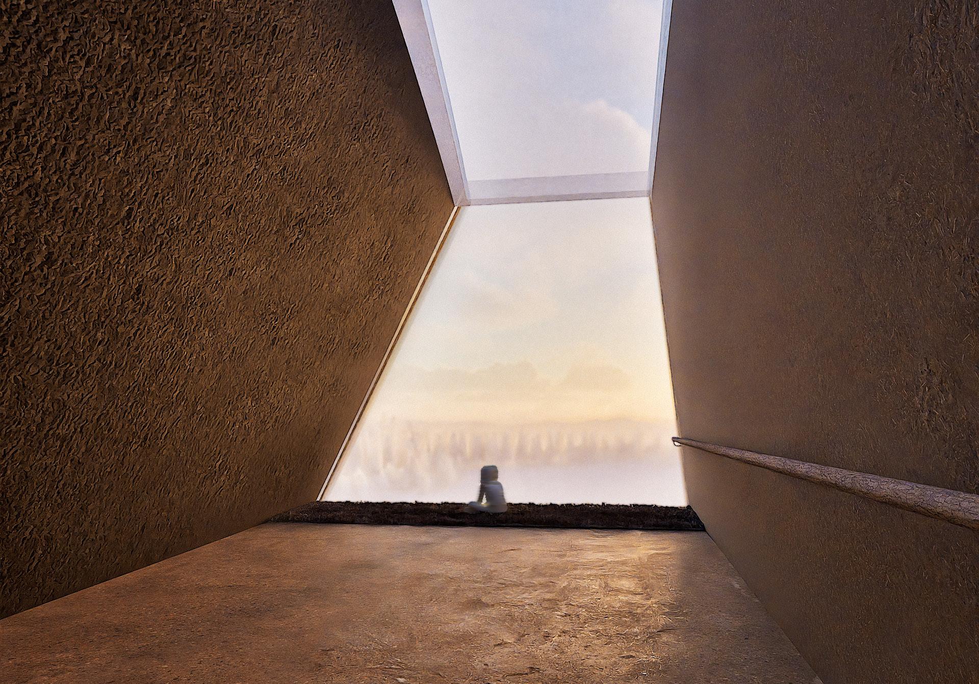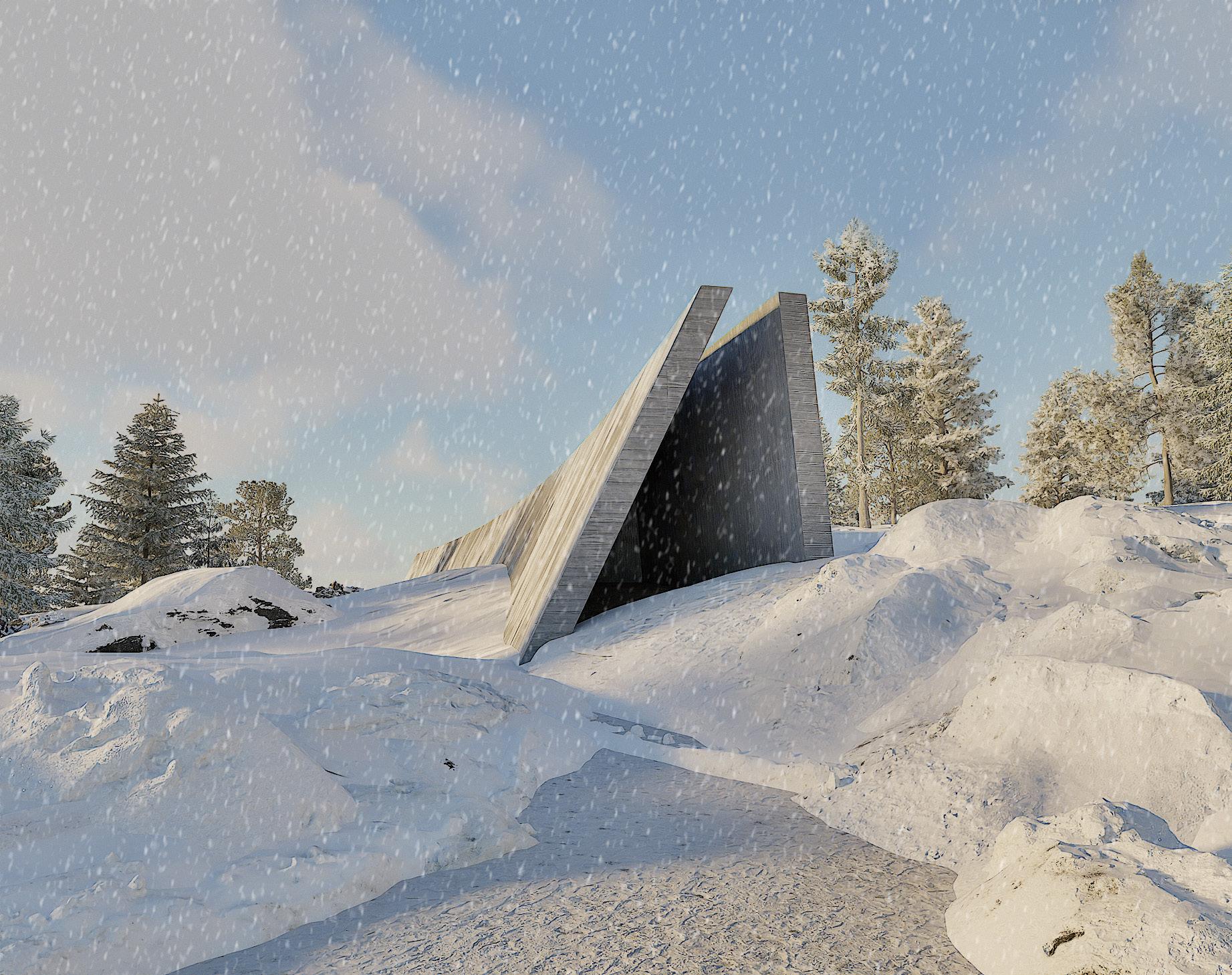 Museum of Emotions -kilpailutyössä halusin luoda voimakkaan tilallisen kokemuksen, jossa puristuksen ja vapautumisen tunteet vuorottelevat. Miljöönä toimi suomalainen kallioinen metsämaisema, johon rakennus sulautuu harmaantuneen puuverhouksensa ansiosta säilyttäen samalla veistoksellisen ilmeensä. Tilaa määrittävät kaksi eri kulmassa laskevaa seinää: jyrkempi, kaareva ja hiiltyneellä puulla päällystetty seinä synnyttää painostavaa tunnelmaa, kun taas vastapuolen lämmin savirappaus ja johdattava kaide ohjaavat kohti luonnonvaloa. Kapea reitti kuljettaa kävijän tunteiden ääripäiden läpi pimeydestä kohti avaruutta ja rauhaa, päättyen palkitsevaan järvinäkymään.
