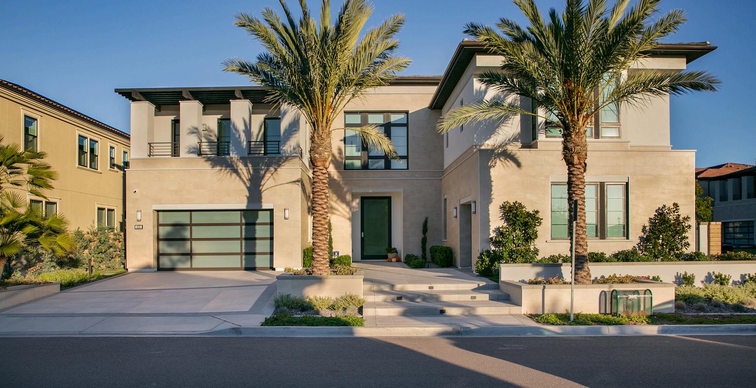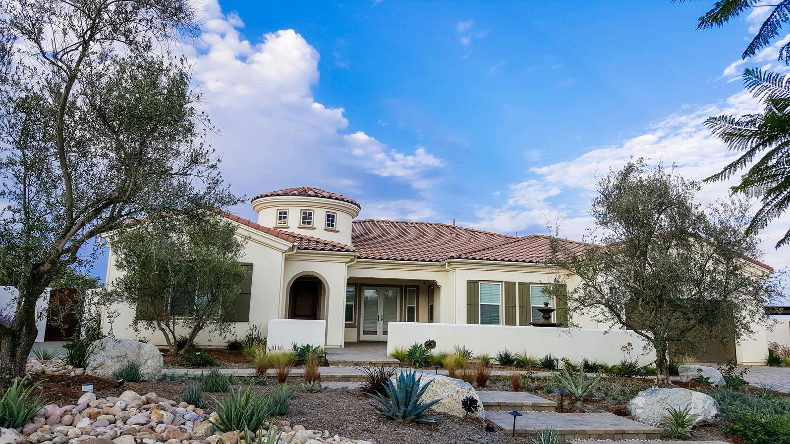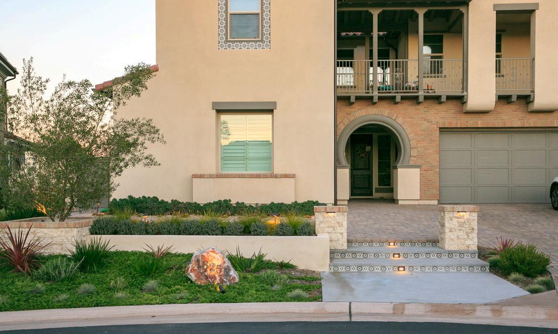 This Rancho Santa Fe home captures the charm of a Spanishstyle resort, blending luxury with low-maintenance living. Drought-tolerant landscaping, a peaceful dry riverbed, and a spacious fire pit create a serene front and side yard