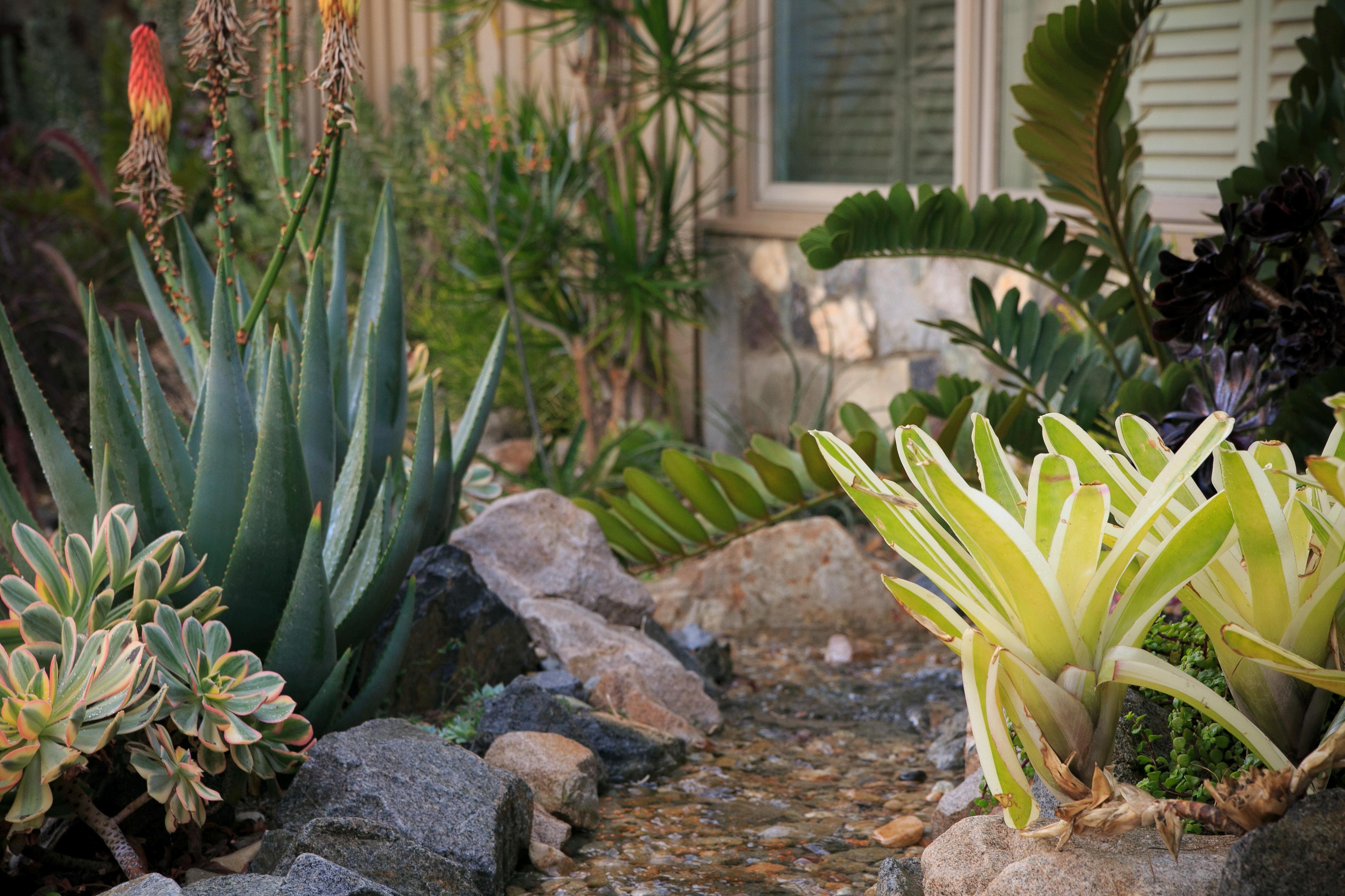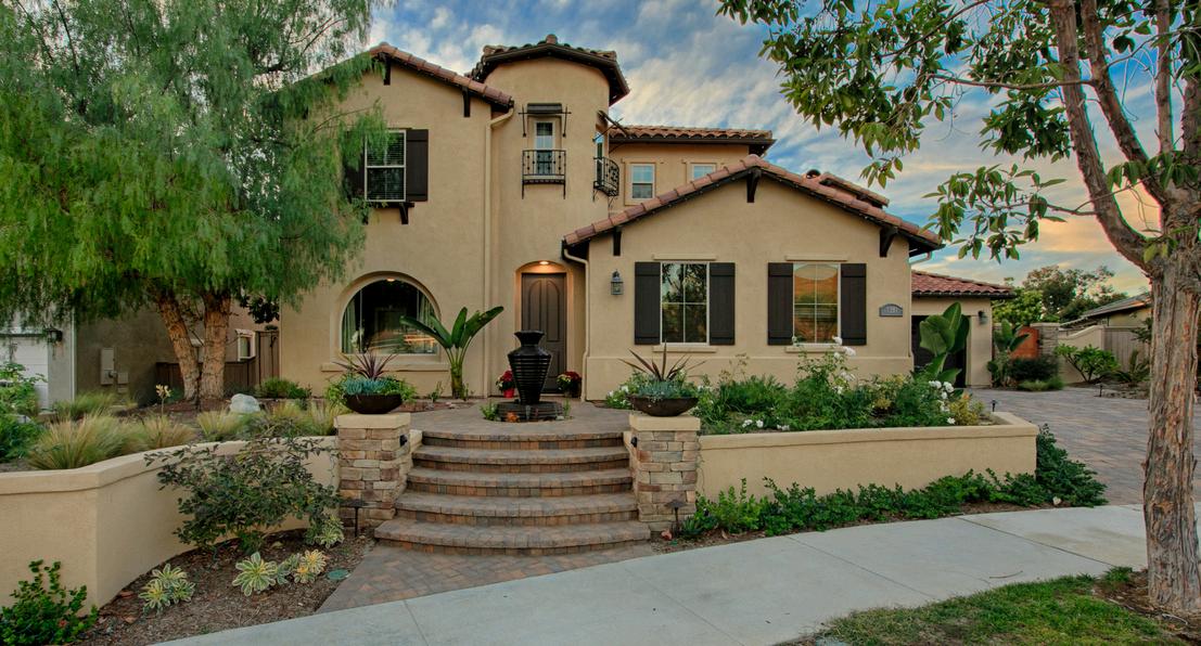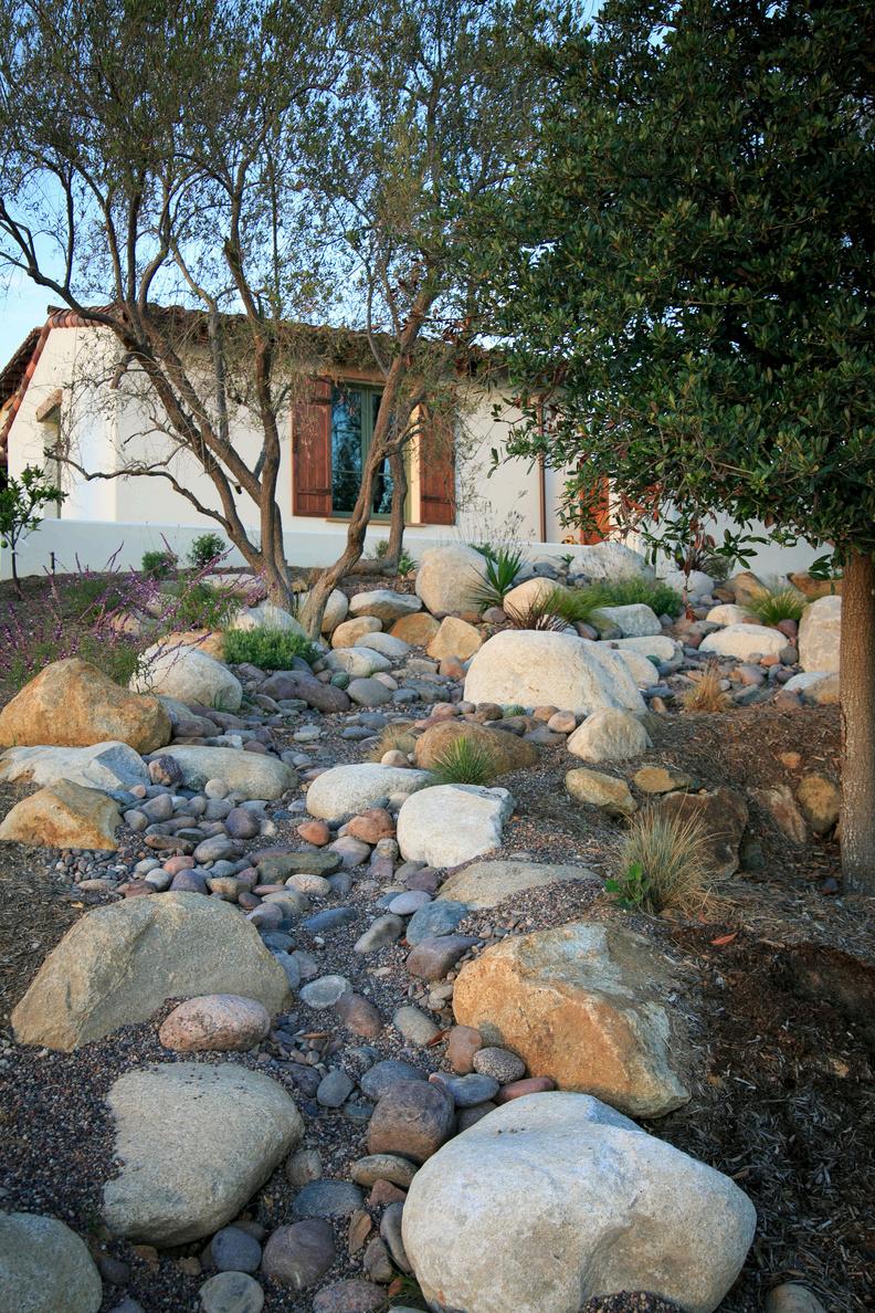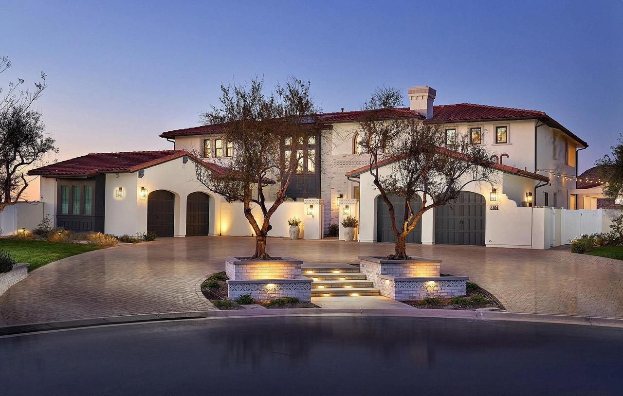 This Rancho Santa Fe home captures the charm of a Spanishstyle resort, blending luxury with low-maintenance living. Drought-tolerant landscaping, a peaceful dry riverbed, and a spacious fire pit create a serene front and side yard
