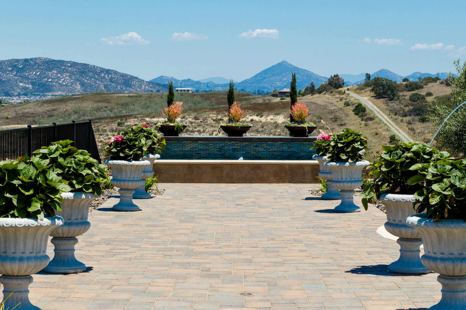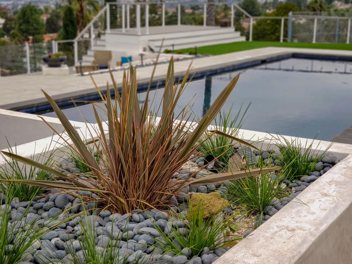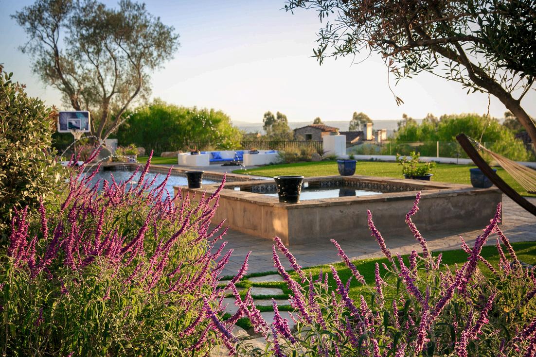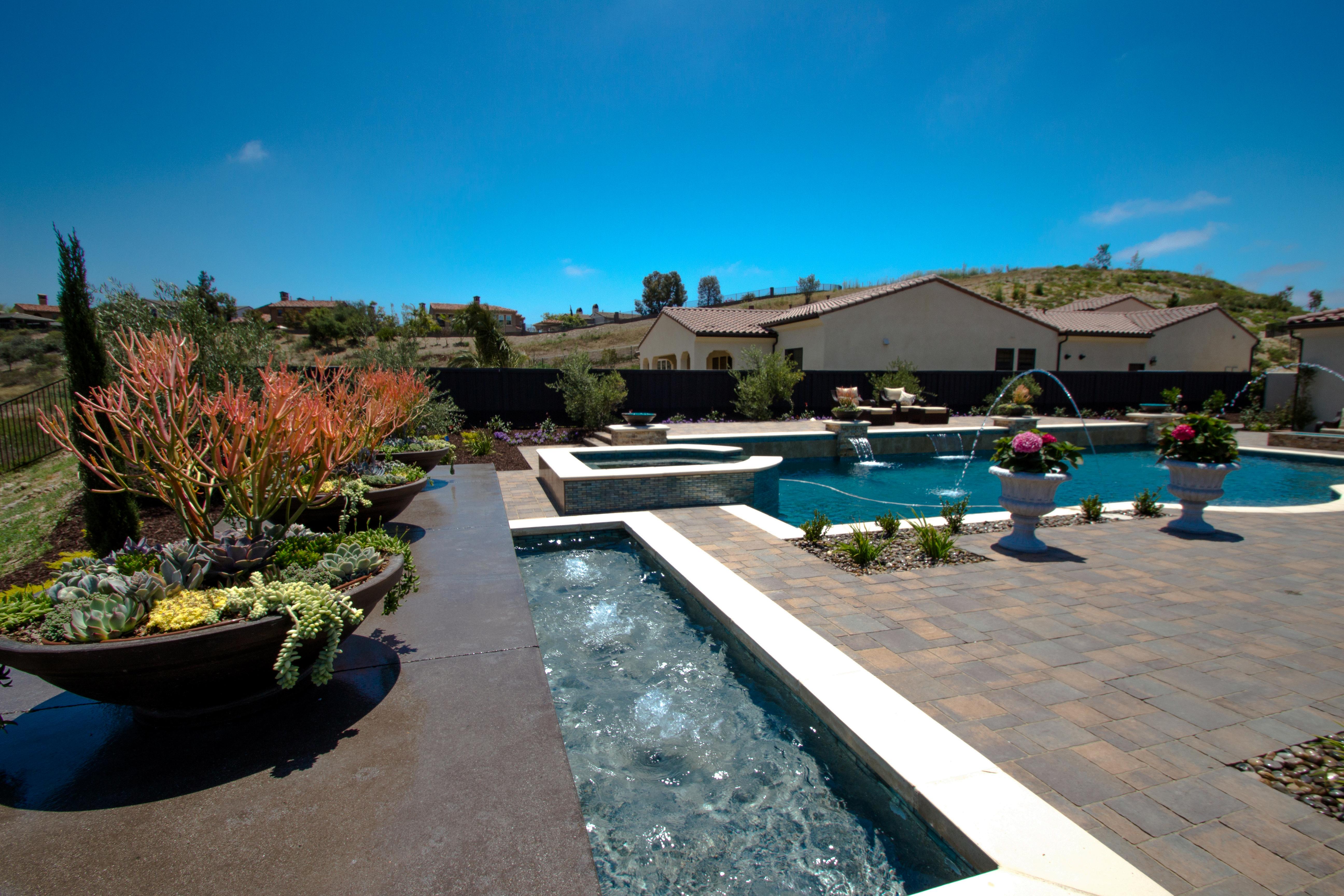This spacious Rancho Santa Fe yard offers a peaceful escape, centered around a stunning pool and layered lounge areas that invite relaxation. Cascading water features, elegant pots, and sweeping views create a refined atmosphere where every detail enhances the sense of calm and beauty Designed for both quiet moments and scenic strolls, the space feels effortlessly luxurious and serene.