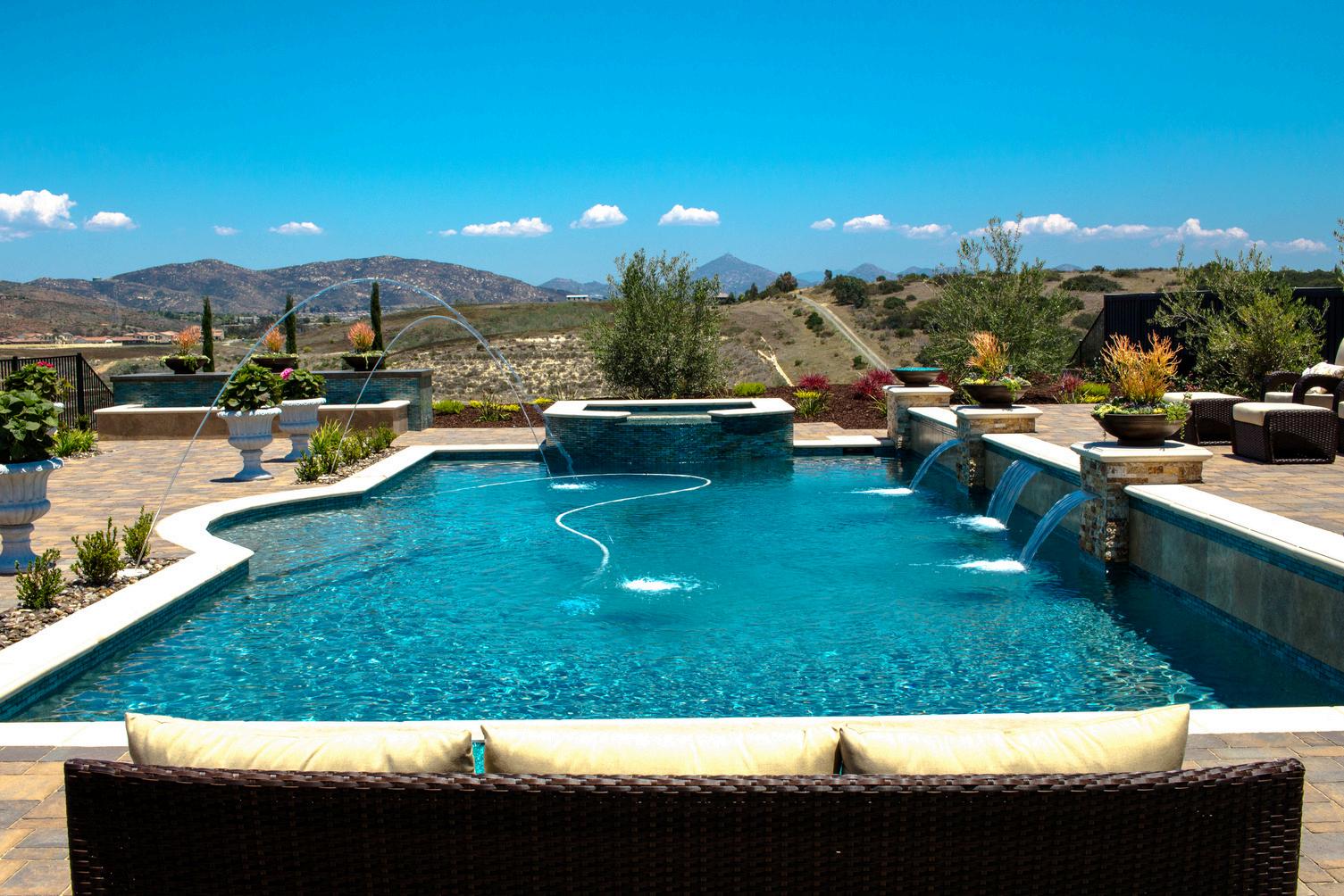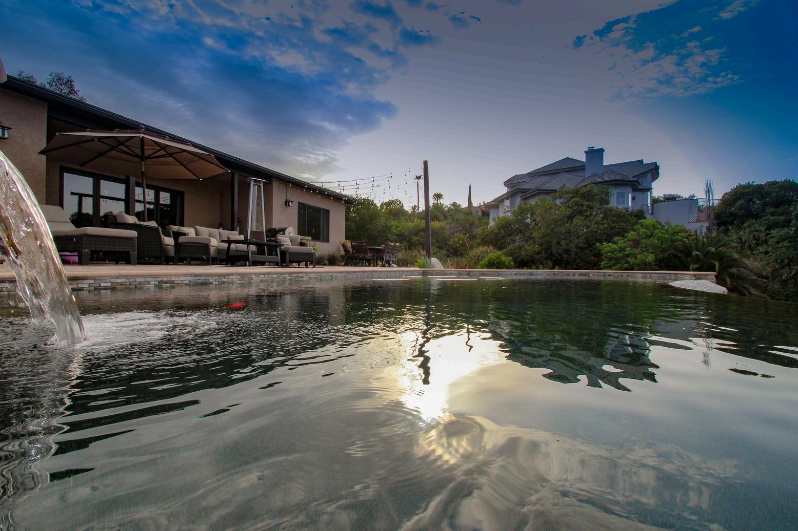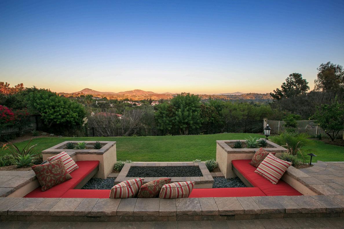 This spacious Rancho Santa Fe yard offers a peaceful escape, centered around a stunning pool and layered lounge areas that invite relaxation. Cascading water features, elegant pots, and sweeping views create a refined atmosphere where every detail enhances the sense of calm and beauty Designed for both quiet moments and scenic strolls, the space feels effortlessly luxurious and serene.