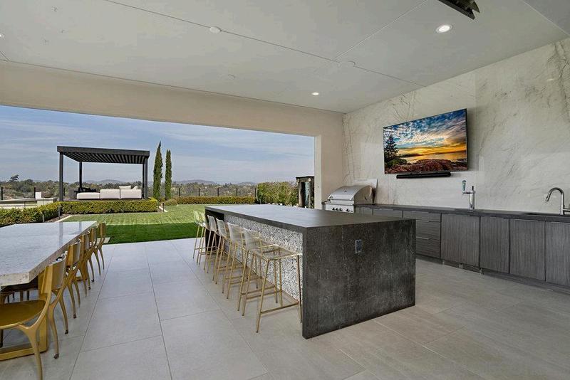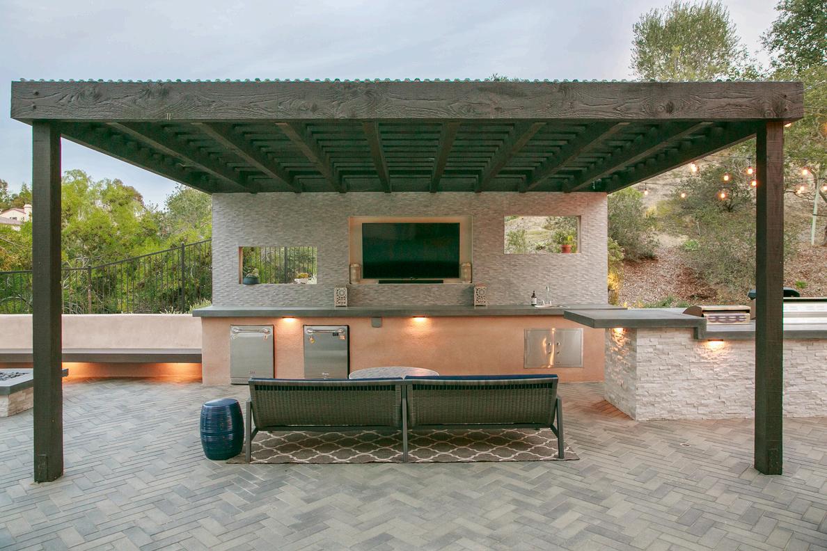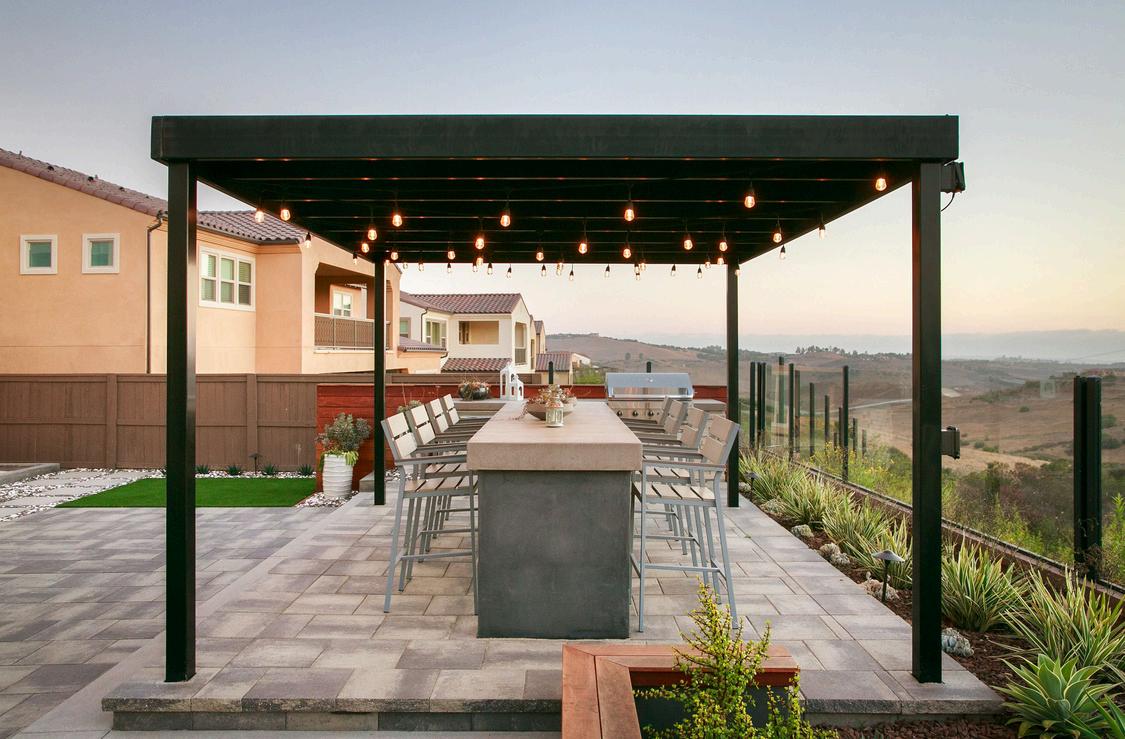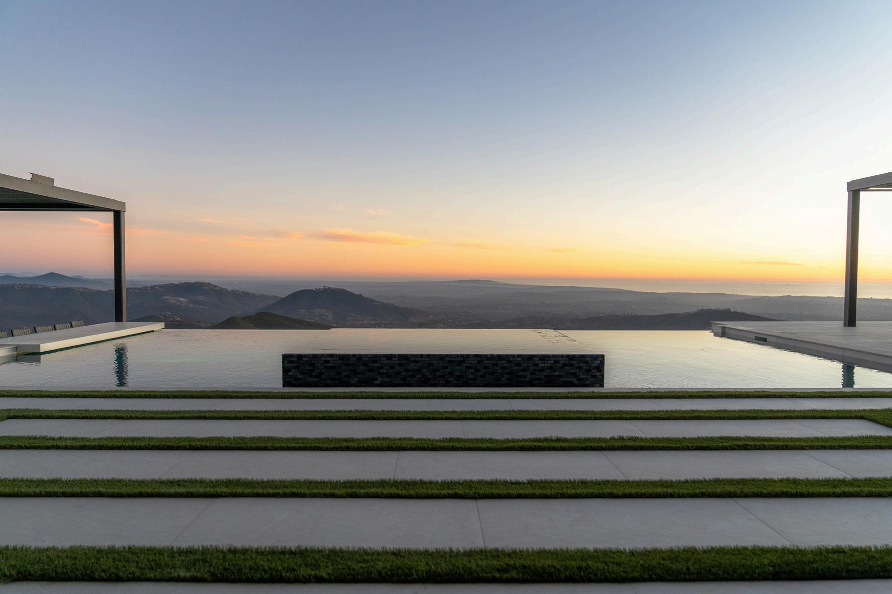 Set high in San Elijo Hills, this modern hillside retreat features sweeping ocean views, refined finishes, and bold design. A raised infinity-edge pool, louvered pergola with a full outdoor kitchen, and a fire lounge perched above the valley make this space perfect for both entertaining and unwinding Clean lines, layered lighting, and low-maintenance materials complete the elevated California experience. J a s p e r