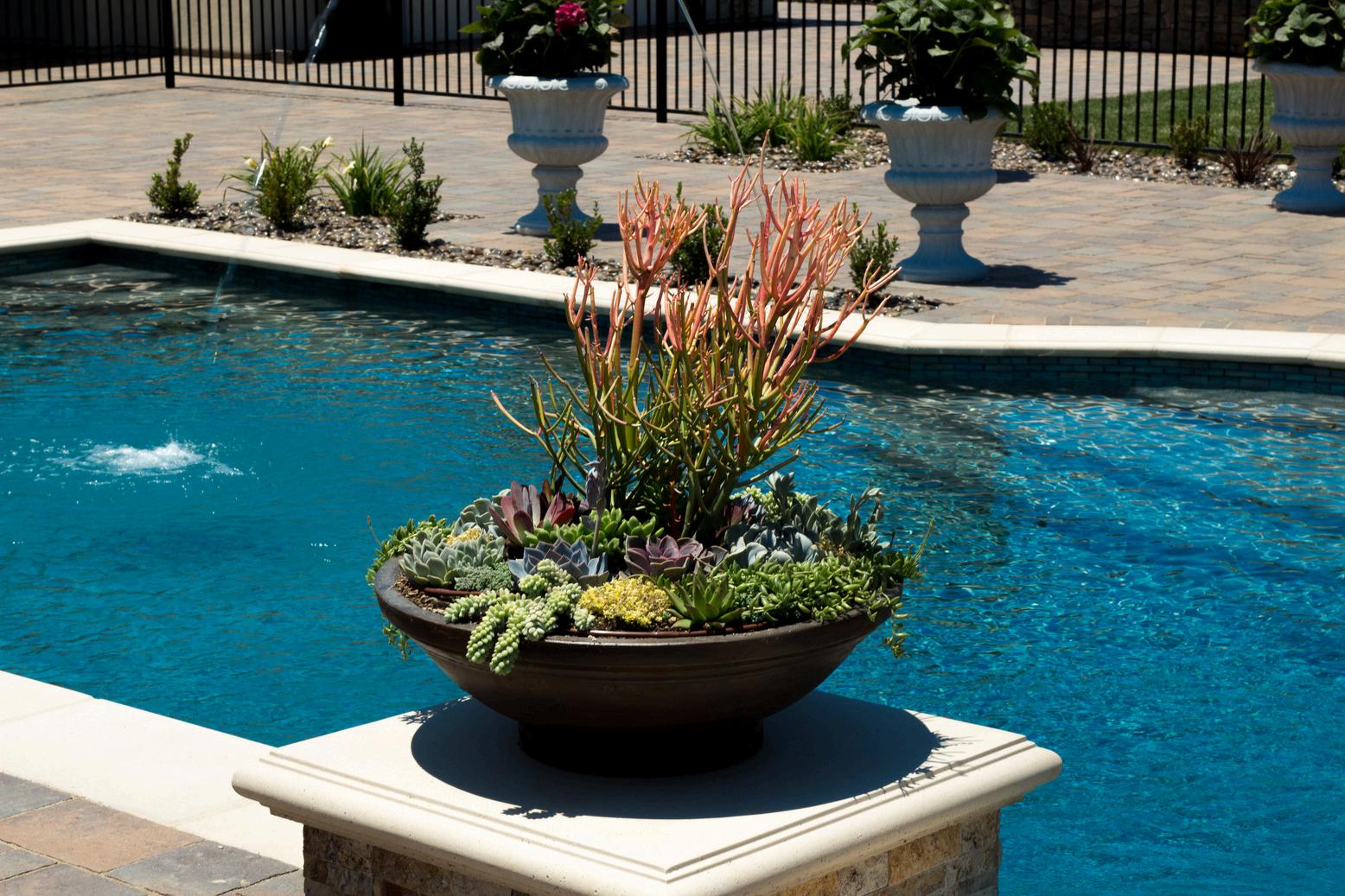 This one-of-a-kind pool pairs traditional charm with standout modern touches. Framed by lush plantings and timeless materials, the design features a central in-pool lounge, elegant water features, and a unique stepper path that invites interaction Every detail adds to the sense of relaxation and sophistication, creating a space that's both classic and fresh.