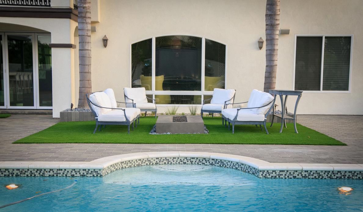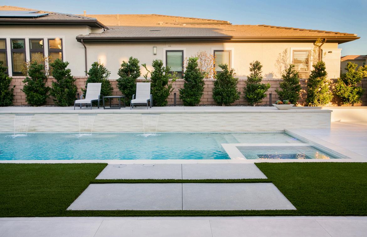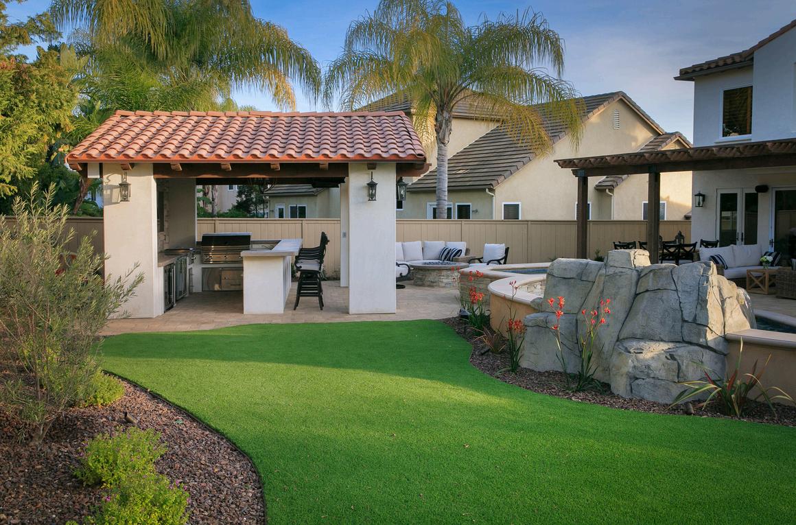 This resort-inspired backyard blends comfort and style with a spacious covered cabana as its star attraction. Outfitted with a built-in bar, cozy seating, and a TV wall, the cabana offers a shaded escape just steps from the pool. A natural rock water feature adds movement and sound, while the surrounding turf keeps the space lush and low-maintenance, making it ideal for both lively gatherings and quiet lounging.