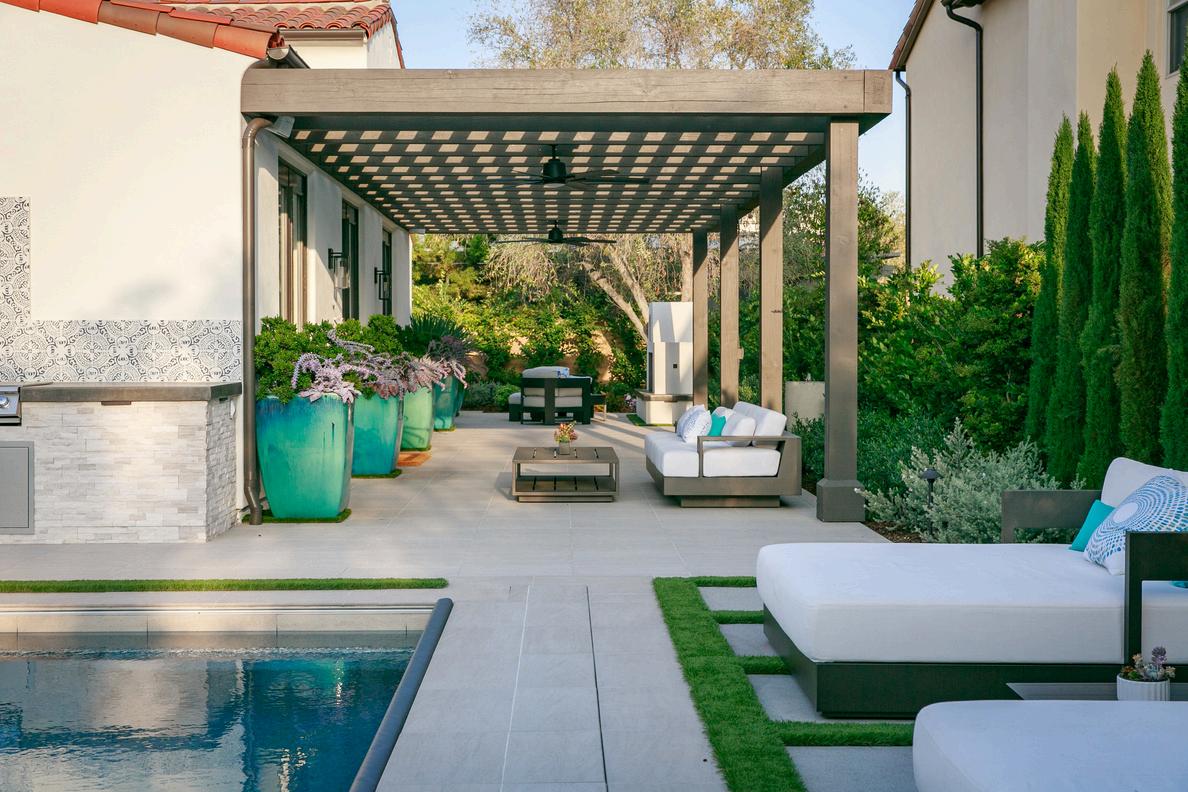 This yard uses every bit of space wisely. A clean-lined pool, turf inlays, and porcelain pavers create structure, while planted pots and a shaded pergola add warmth and comfort. It’s a simple setup that feels polished, with just enough room to relax, gather, and enjoy the outdoors