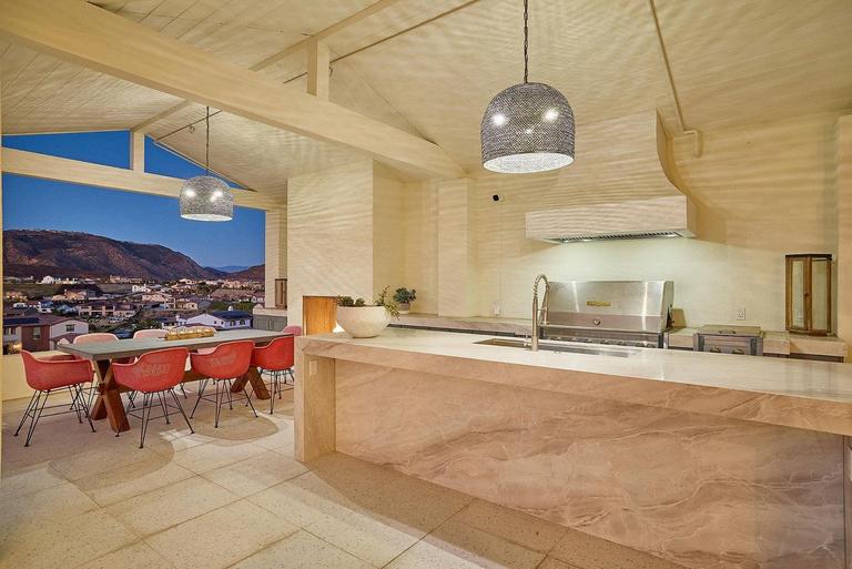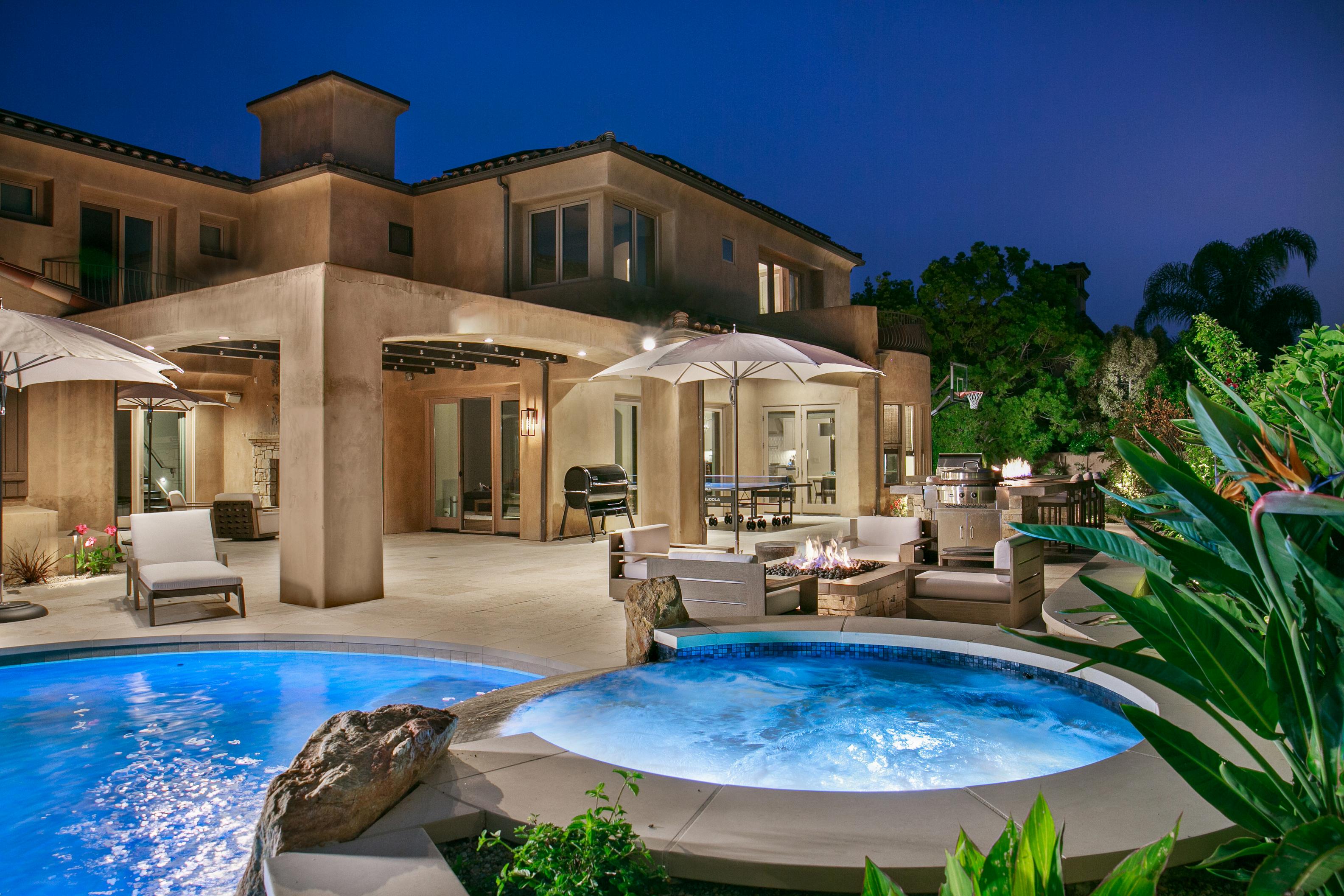 Perched atop a Santa Luz hill, this backyard offers a breathtaking panorama: majestic mountains to the north and east, and the captivating coastline to the west. By day, its beauty is undeniable; but by night, it transforms into an enchanting spectacle Crafted with natural stone, concrete pavers, and pristine white stucco, this space exudes sophistication while ensuring easy maintenance.