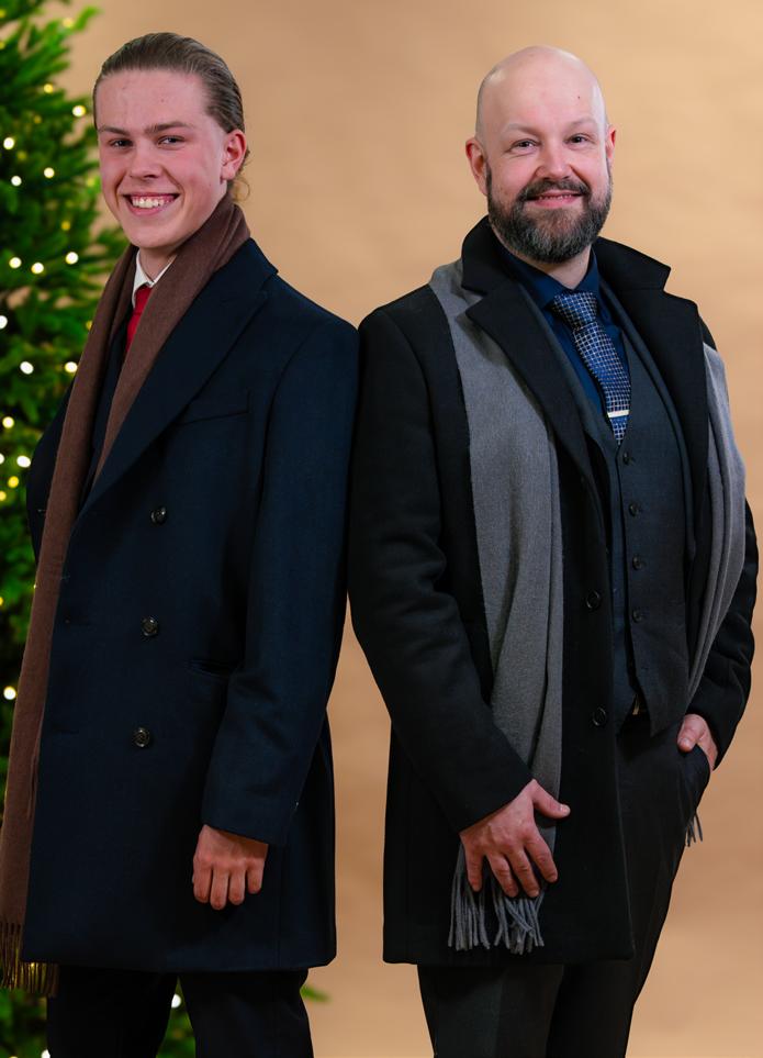 Tøff og trendy Blå frakk 1.999,Brunt skjerf 399,Svart frakk 1.499,Grått skjerf 399,fra Dressmann