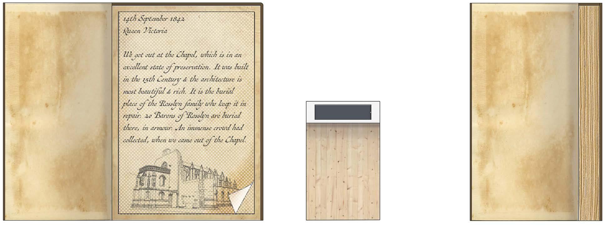 Designed to look like an old book with the title ‘Rosslyn Chapel’s Guest Book’ in gold on the cover. Inside will be a touch screen imedded into a wooden frame. The page will turn when the visitor swipes across it to reveal the next entry. A drawing of the chapel will give context to the time period.