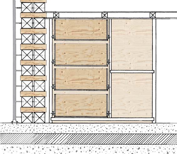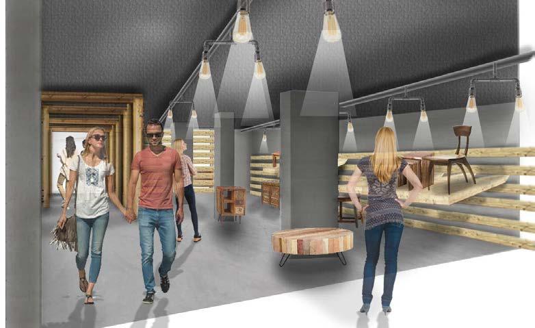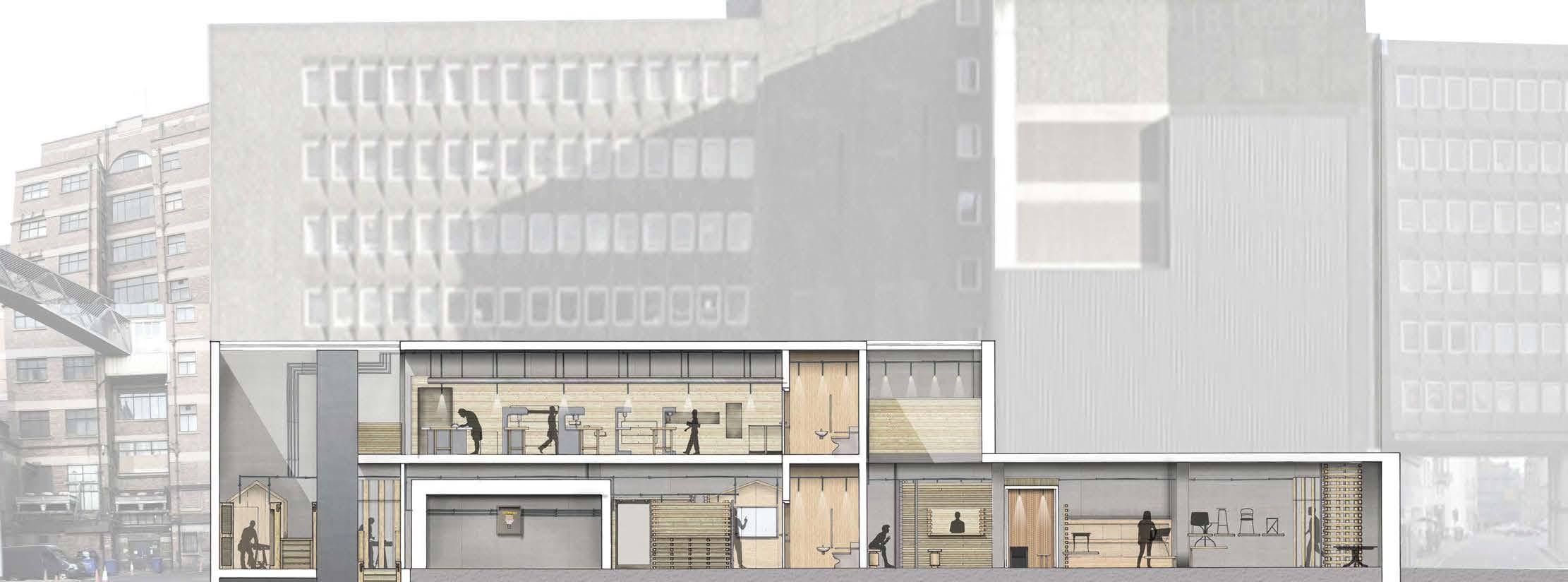 The function of the space is a wood workshop, where the young people going to the YMCA can gain qualifications and experience in carpentry, from design, to machining, to assembly, and then retail.