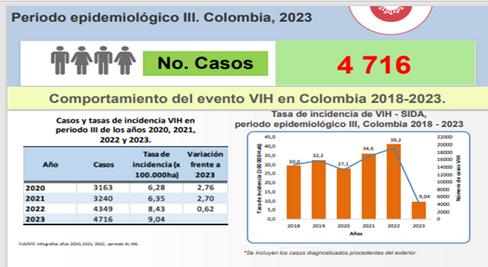 Casos de VIH: durante el periodo epidemiológico III de 2023, se han notificado 4,716 casos de VIH en Colombia. Las tasas de notificación de casos confirmados de VIH/SIDA es de 11,4 por 100.000 habitantes, y la tasa de incidencia es de 8,7 por 100,000 habitantes.