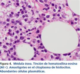 Biología molecular Análisis molecular del ADN extraído de la biopsia renal. Detección del gen TOP2 de Leishmania (donovani/infantum) mediante el kit RealCycler DONO (BioRad). Control de amplificación: positivo. Asimismo, dado el grado de afectación hematológica, se realiza también biopsia de medula ósea (v. fig. 3; fig. 4). Se evidencian abundantes histiocitos con amastigotes de Leishmania en su interior, imágenes de hemofagocitosis y áreas de degeneración mucinosa del estroma. Se observa plasmocitosis policlonal. El análisis molecular del ADN extraído del extendido de aspirado de médula ósea detecta el gen TOP2 de Leishmania.