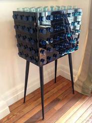 b 1947, Italy opaline, glass and steel 1950s glass mounted cabinet on stand The original 1950s cabinet has been augmented with blue glass and elegant legs.
