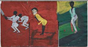 ‘Hitler Playing Cricket (with Antiguan Men)’, c 1975-80 oil on card Self taught, Walter painted from his vivid imagination, interest in science and delight in nature, on whatever materials he had to hand