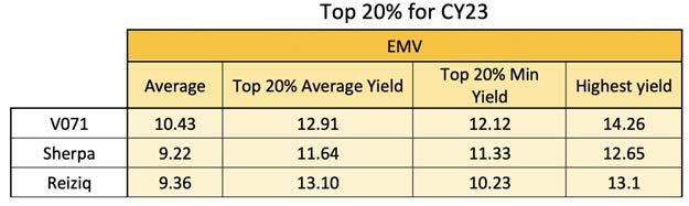 The EMV wasn’t immune to the lower yields of other regions. V071 was the highest-yielding variety at 10.43t/ha, 1.21t/ha higher than Sherpa. The impact of the CY23 climatic conditions was evident in V071, yielding 1.34t/ha on average less than in CY22.