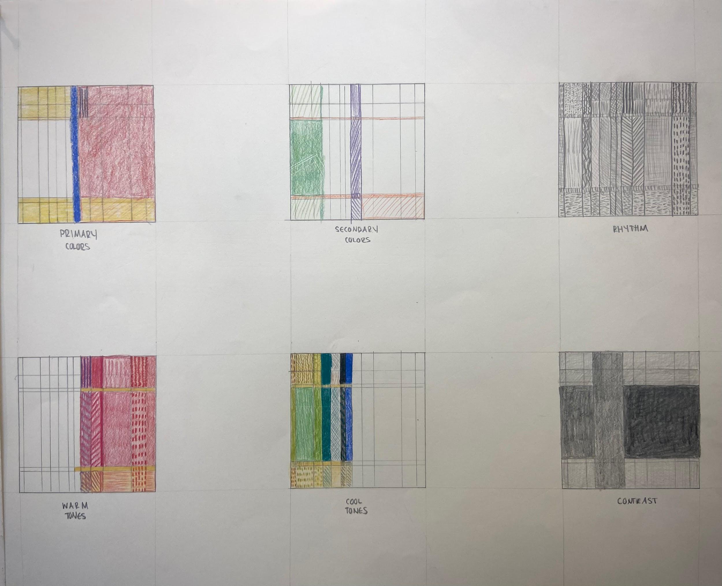 Throughiterationsofideas,itwas requiredtocarveintoanartgumeraser. Thefirstrowshowshowthesimpleshape hastoberepeatedtostampa separated,touching,andoverlapping pattern.Thesecondrowshowsacolor wheelbeingthe“primary”colorsof palettetobecarriedthroughtherestof theboards.Theplaidemphasizedhow the3“primary”colorsinteractwhen overlappedtocreate“secondary”colors. Thecolorpalettewasthenusedtoadd colortooneoftheoriginalstamped patterns.Inthethirdrow,paperhadto befolded,deconstructed,colored,and refolded.Thecolorwaschosento specificareastoemphasizethedepthof thefoldedpaperwiththecolorpalette.