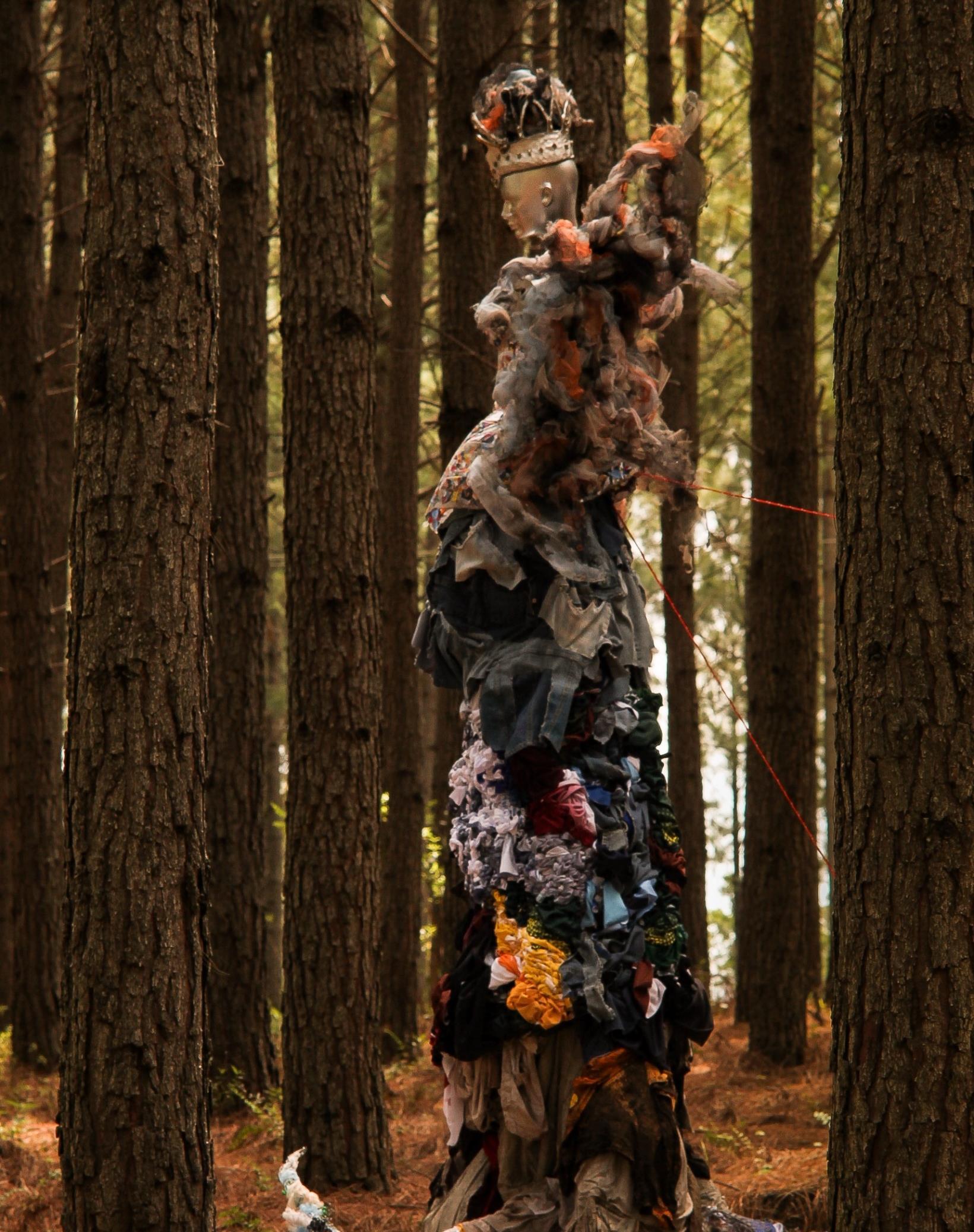 In runway shows, tall models help audiences see designs more clearly. By placing the installation among pine trees, the sculpture mimics the natural environment through its height, shape, and positioning, attempting to blend in despite the contrast between the synthetic figure and the natural forest