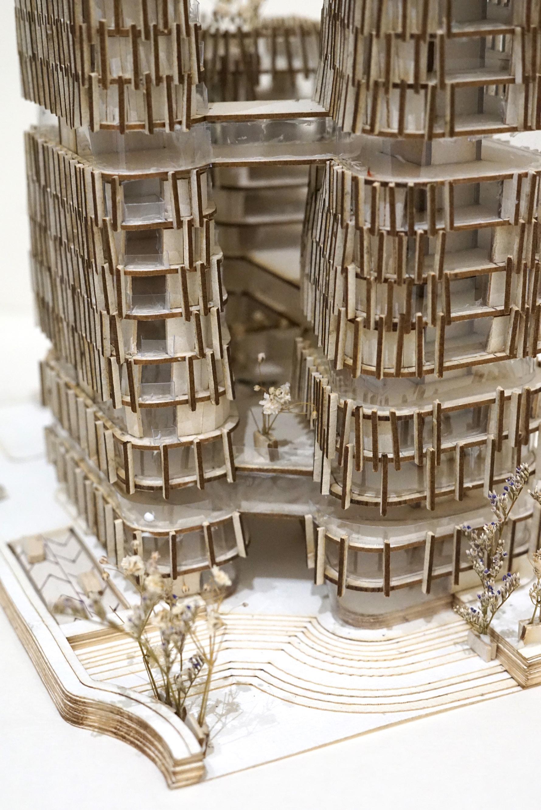 the massing is made slanted to support the connectivity between residents, so that the dwelling focuses on the middle area