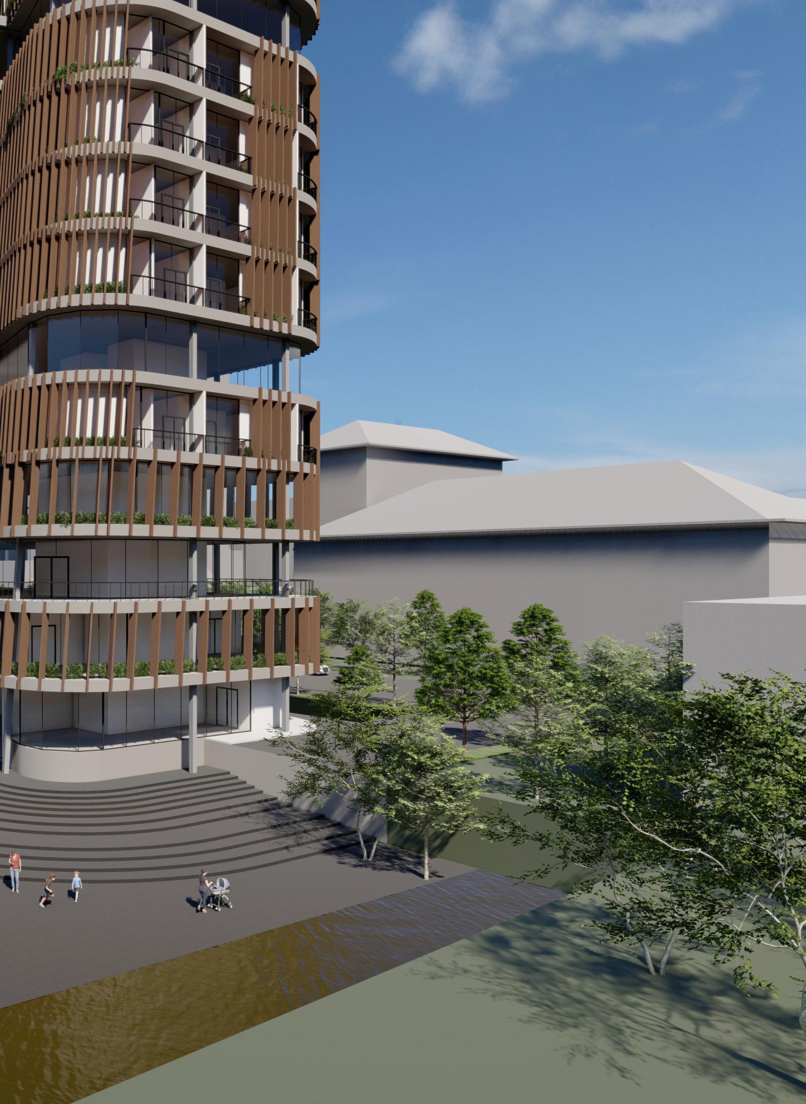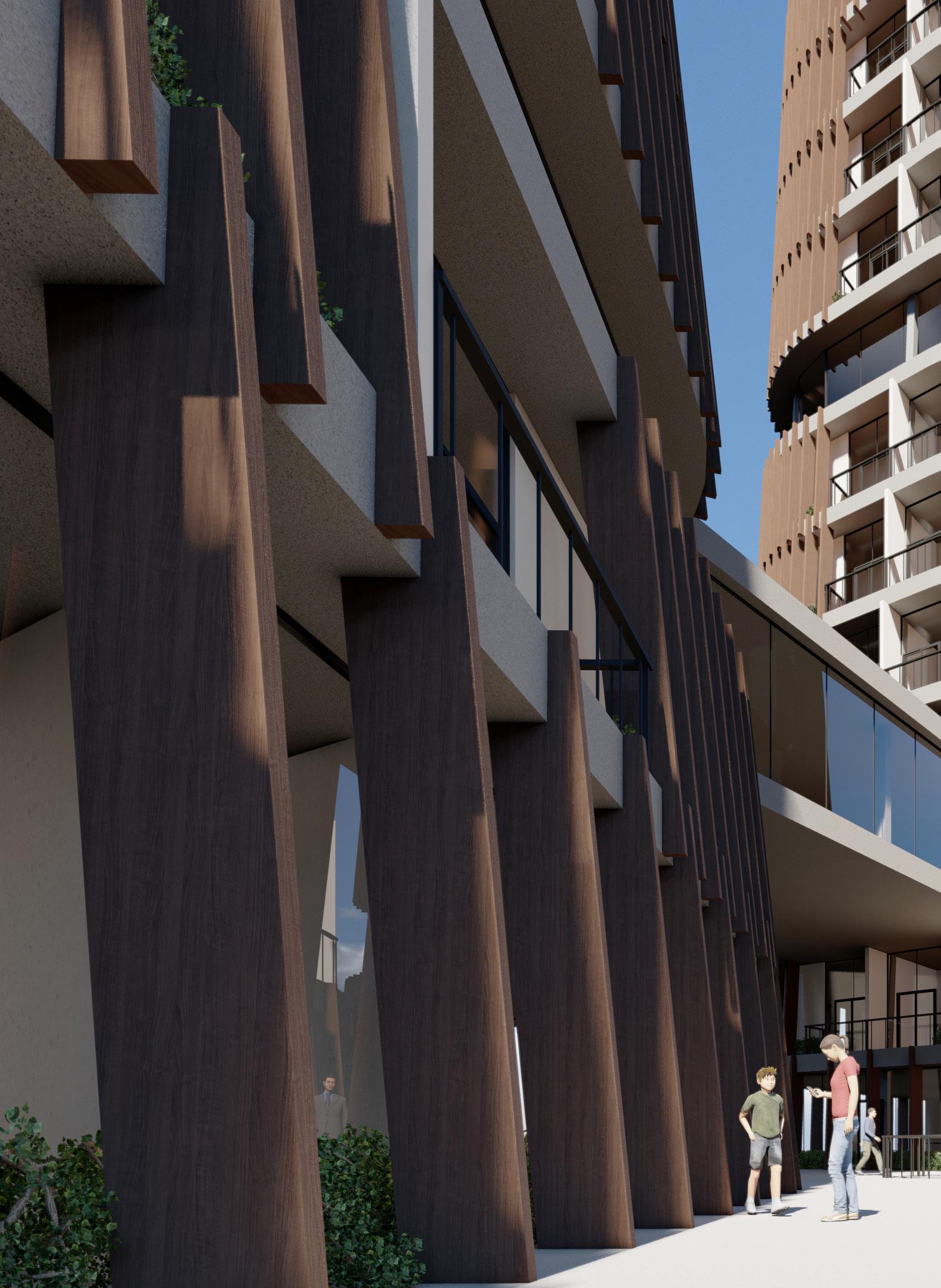 uses vertical wood fins as a barrier from visual exposure from other towers and also to bring back the nature (mini gardens) to each unit