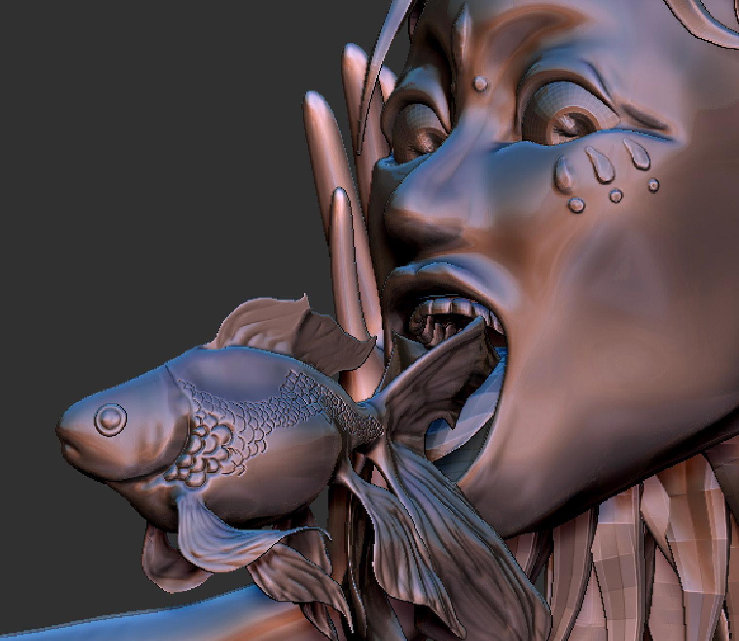 角色模型具有粉色混合藍紫色的金屬光澤質 地,表情猙獰,卻神色自若地拔下自己的頭 部,並且從嘴裡吐出一尾金魚。