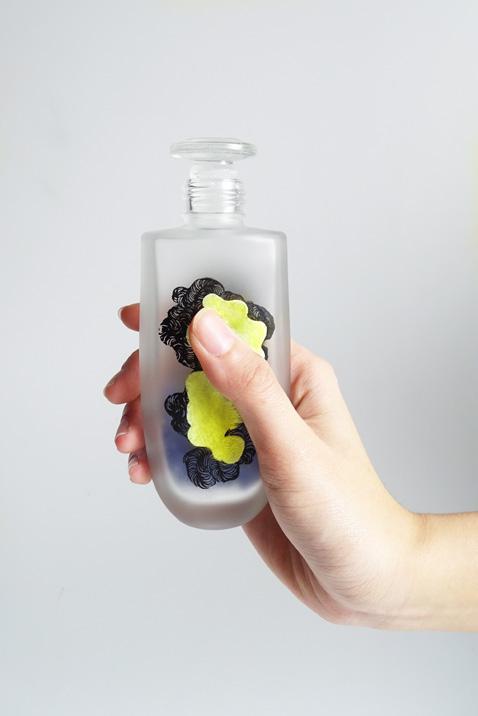 佐以視覺上富蠕動感的線條,圖案使用感溫油墨印 刷,拿取瓶身時觸碰到的地方會變為白色,顏色的消 逝象徵身體裡的廢物被酵素所代謝。