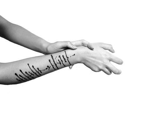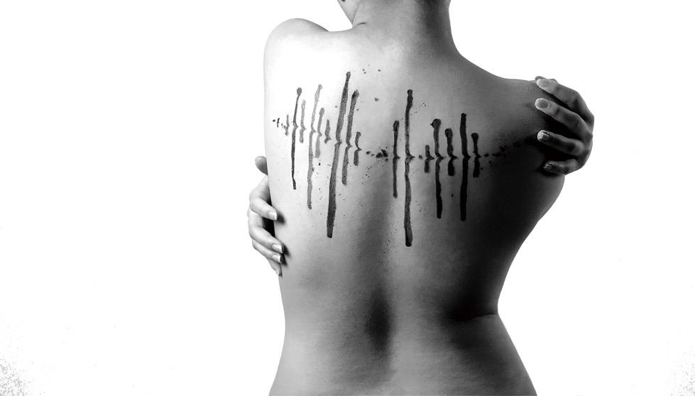 設計首先擷取刺青過程中產生的聲音,並以墨滴重新繪 製錄音音頻;完成圖像設計後,再將圖形繪於模特兒皮 膚之上,還原刺青的表現形式;最後,以攝影的方式完 成主視覺。