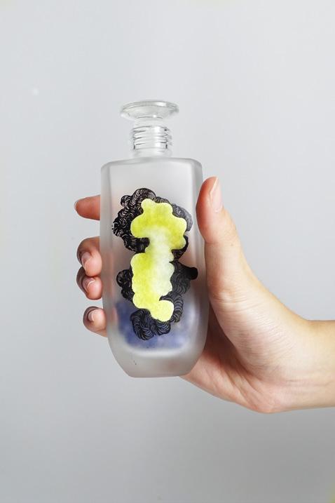 佐以視覺上富蠕動感的線條,圖案使用感溫油墨印 刷,拿取瓶身時觸碰到的地方會變為白色,顏色的消 逝象徵身體裡的廢物被酵素所代謝。