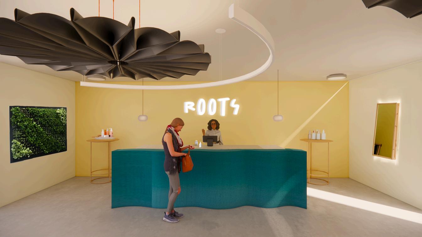 This rendering is of the cash wrap in the salon/ retail space. Here there will be accessibility to curl friendly products and services.