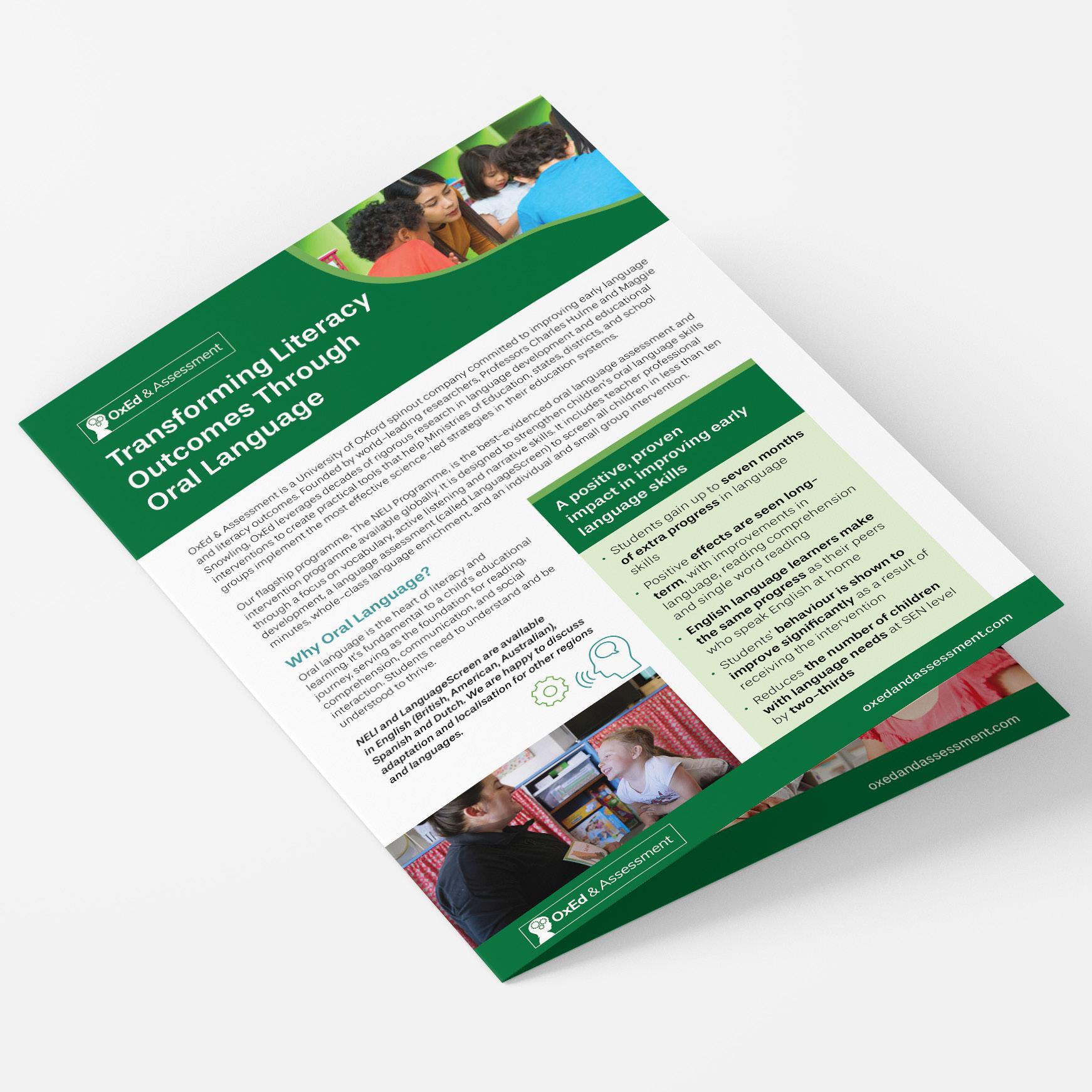 I created this Brochure for OxEd & Assessment, for a Ministry of Education event, to show potential customers who OxEd & Assessment are and what they do. This brochure contained case studies and research highlighting the positive impact of NELI (Nuffield Early Language Intervention) on children’s language and reading skills.