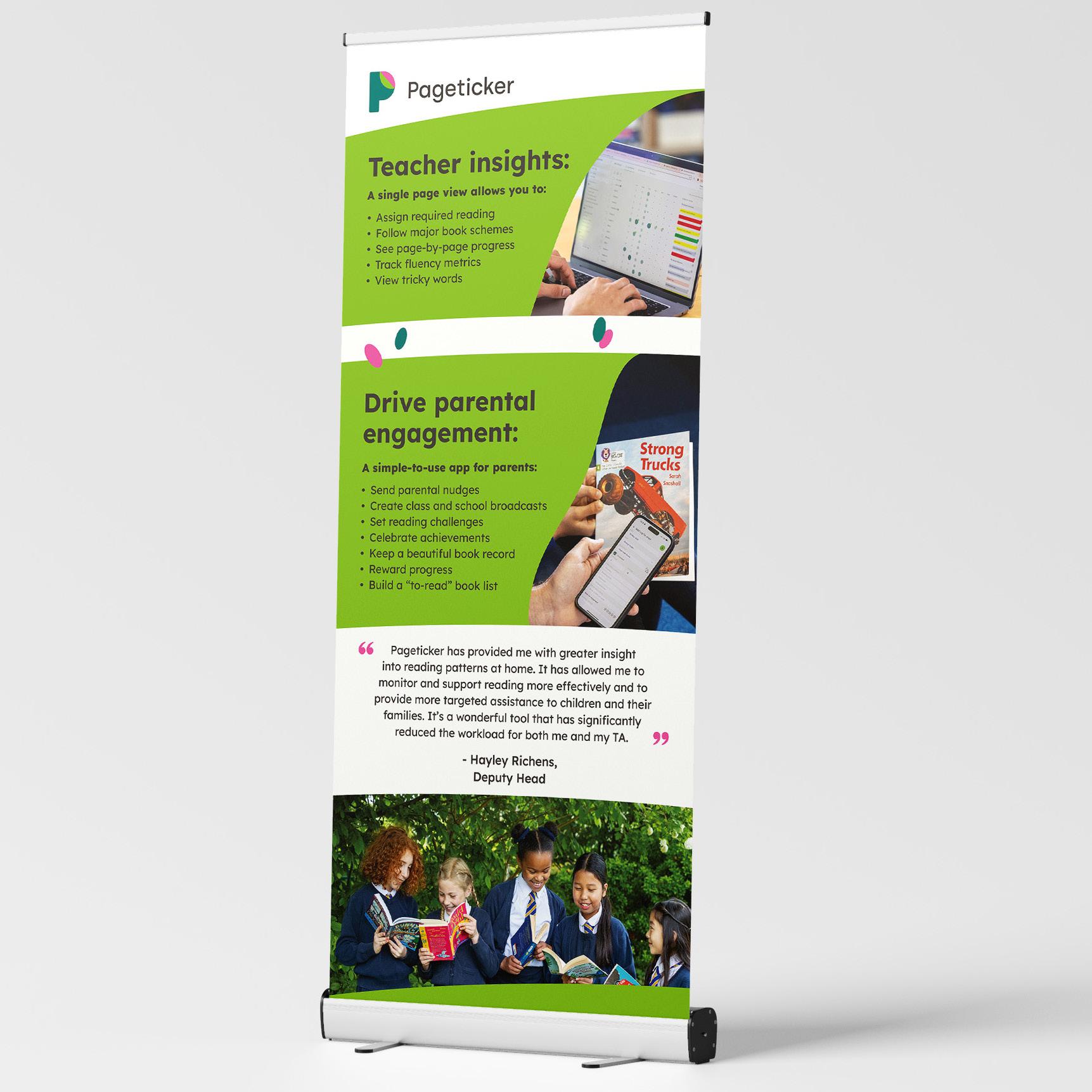 I created these banners for Pageticker to use at Educational events advertising thier services. I was responsible for setting this file up for print and making sure the copy and imagery was at an appropriate height to be seen as part of their stall setup