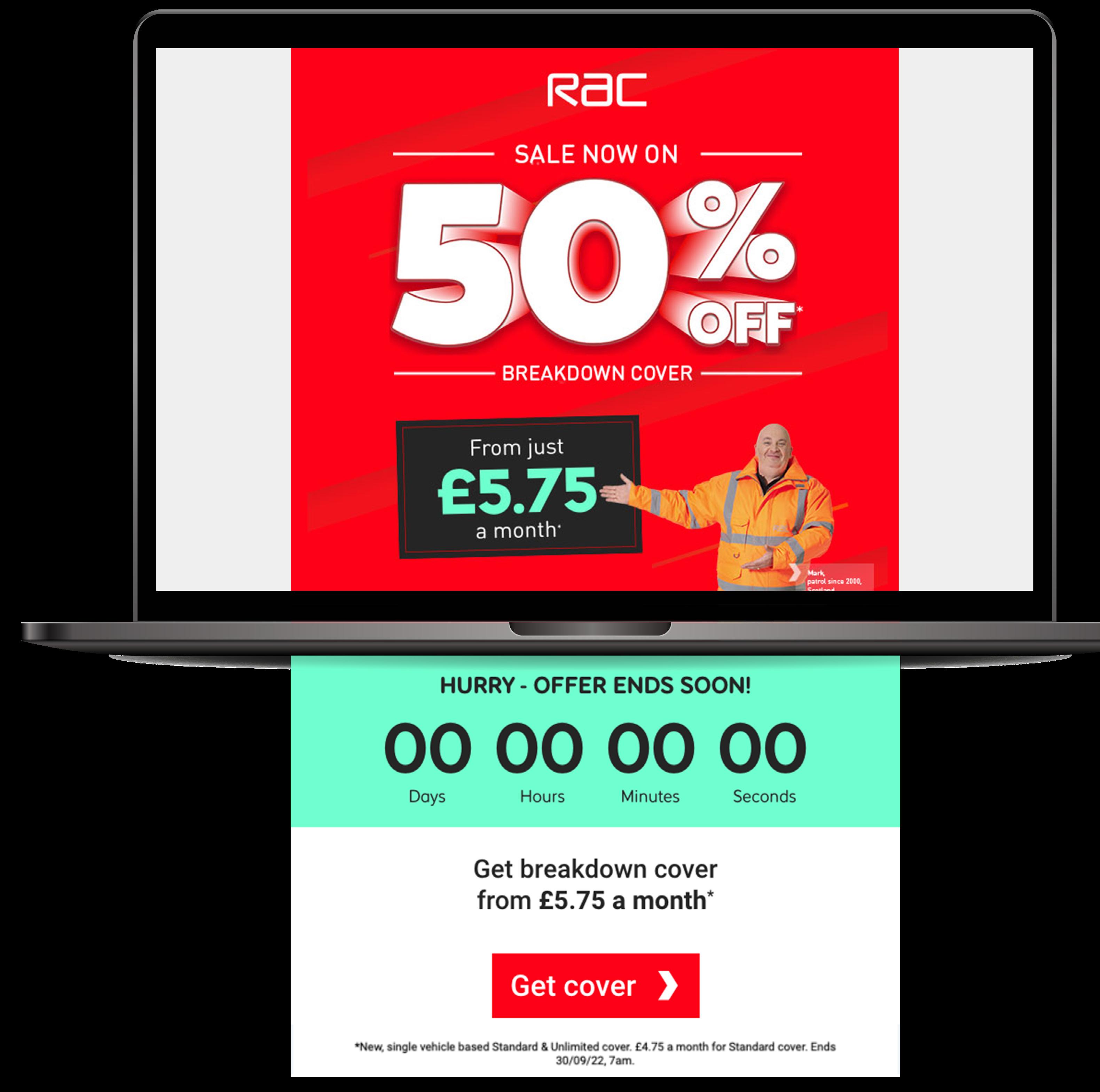I designed this sale template in collaboration with the midweight designer. We both created rough scamps and ideas and the final decision used a combination of both of our designs. I was solely responsible for creating all the sale assets in differing sizes once the design had been chosen, creating all the assets within a day. Animated gifs were often used, enabling us to show more information within the sale asset. Assets were shown on the RAC homepage, Route planner, social media, emails and the RAC blog called DRIVE.